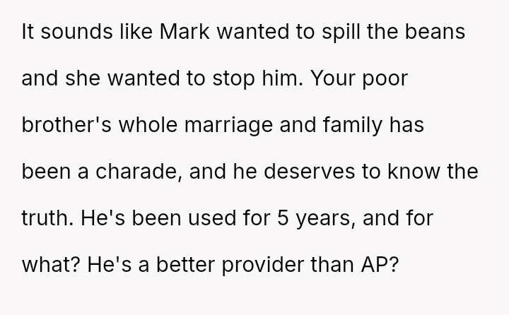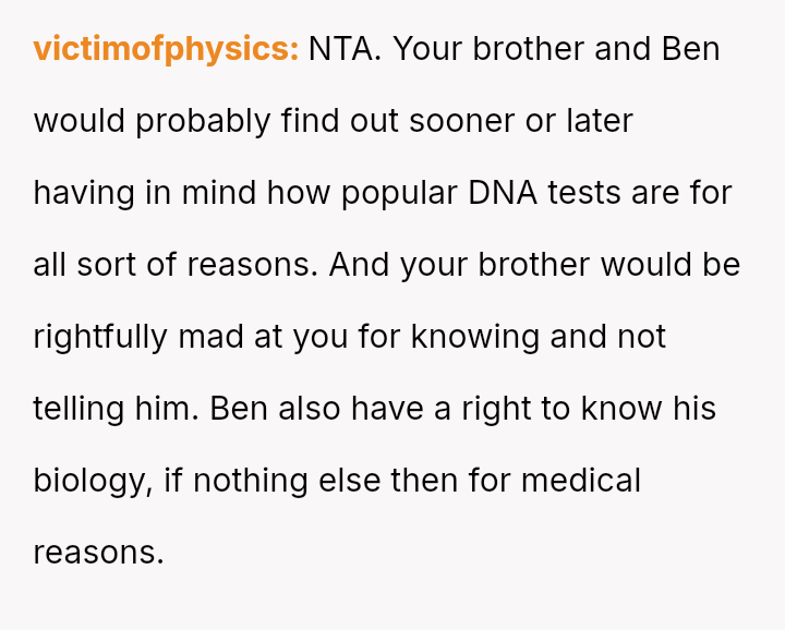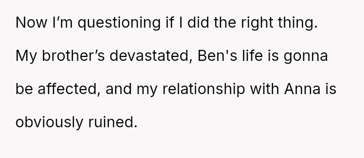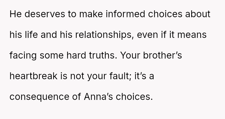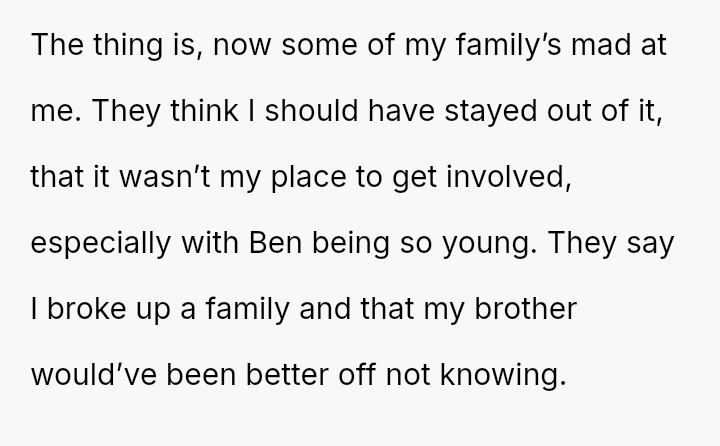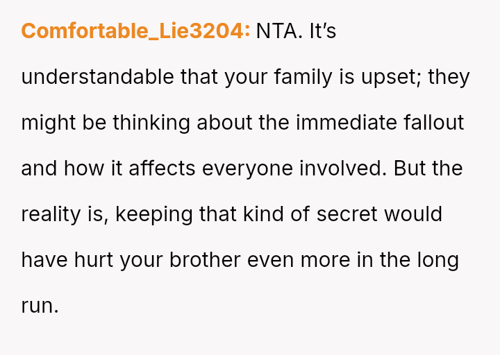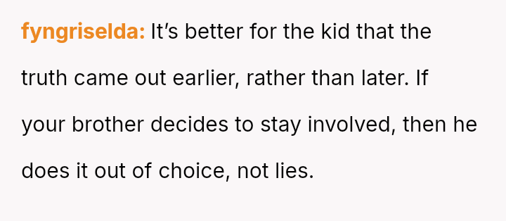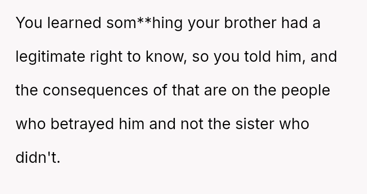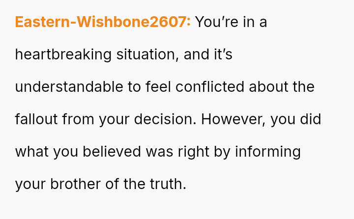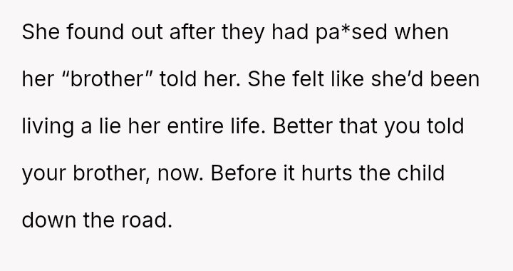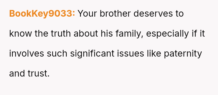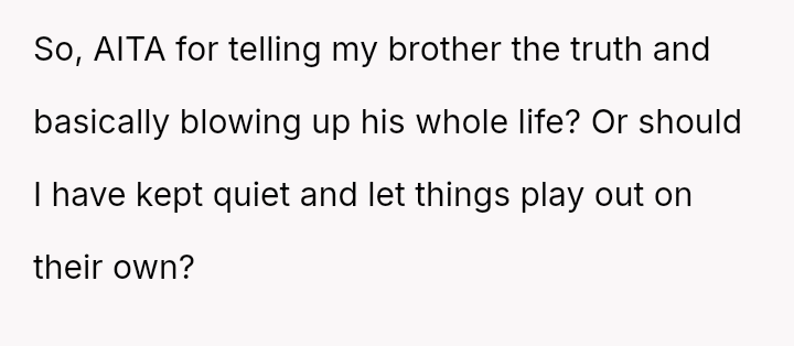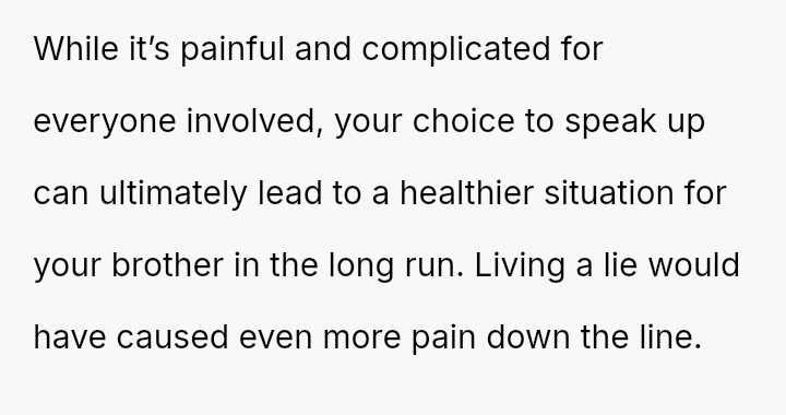 Was the OP justified in prioritizing their brother's right to factual knowledge over the s**bility of his marriage and child's current familial perception, or would remaining silent have been the more compa*sionate action in the long run? This remains the core ethical dilemma.