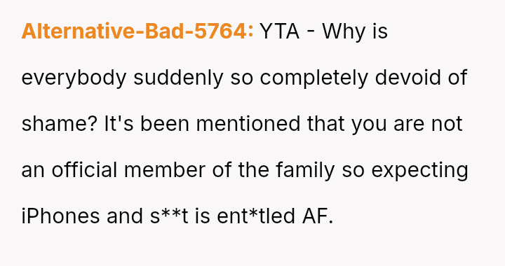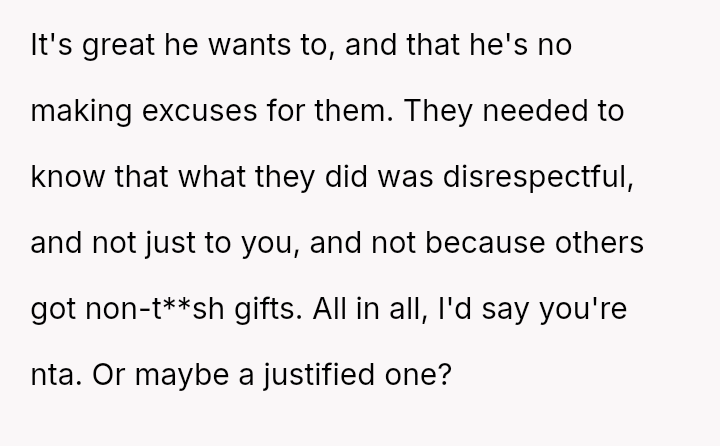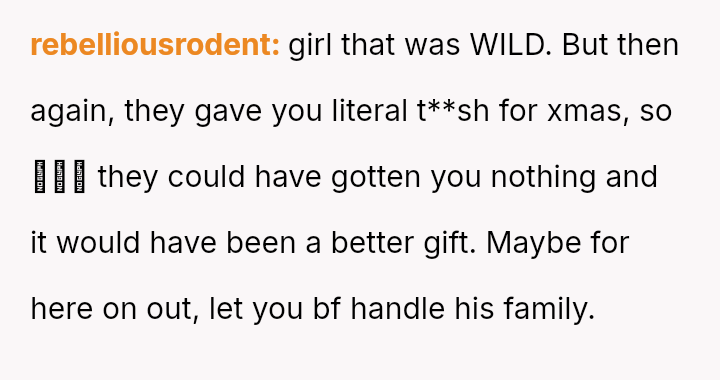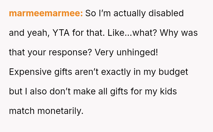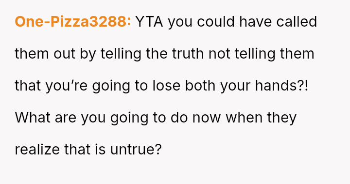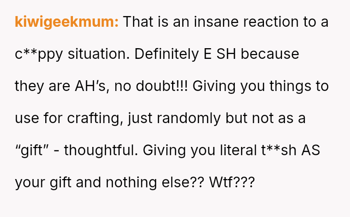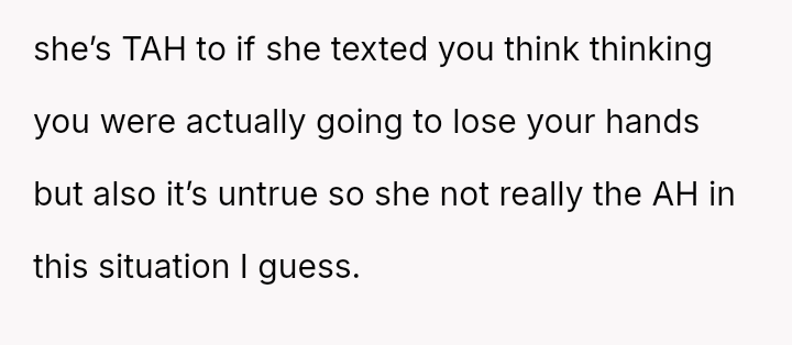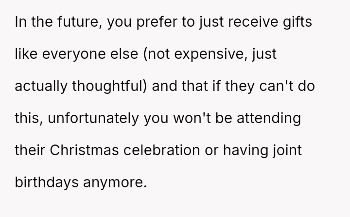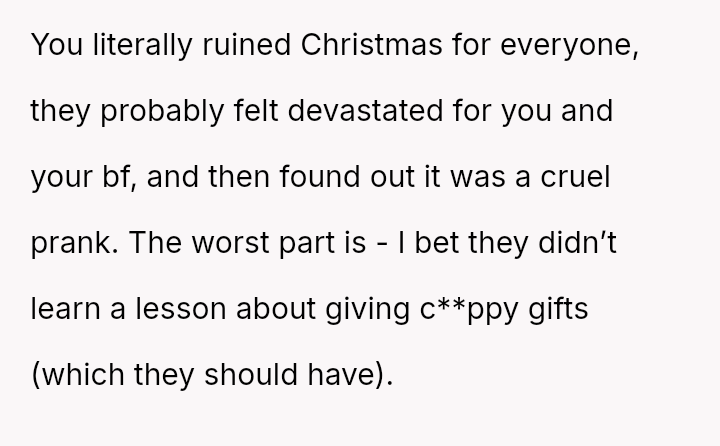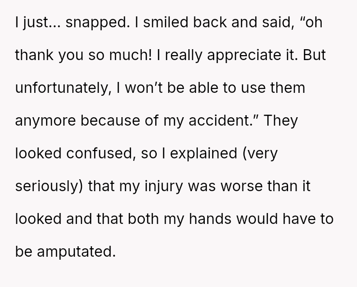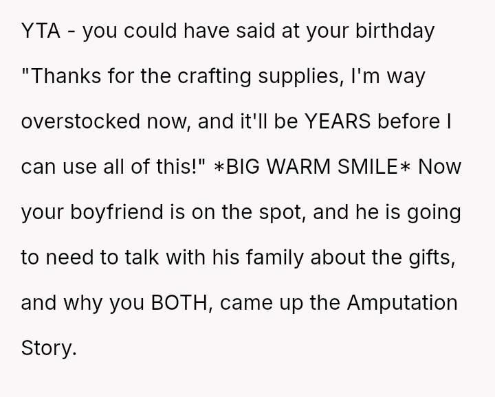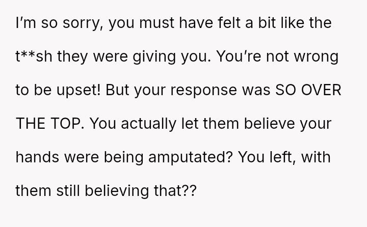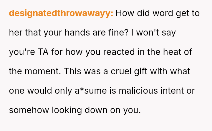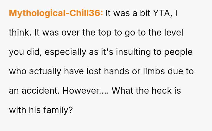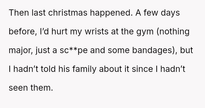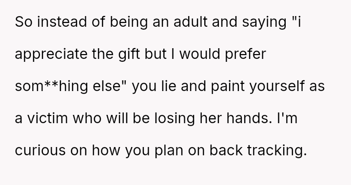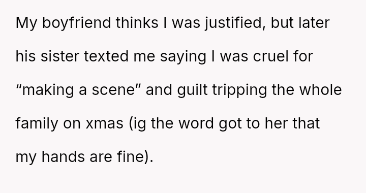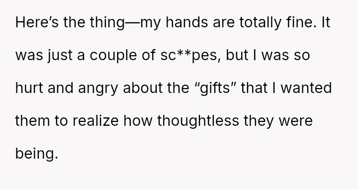 After a similar pattern of perceived slight during Christmas, where she received dirty sc**ps after injuring her wrists, the user fabricated a story about needing hand amputations to shock the family into realizing how hurtful their gift choices were. Now, she questions if her extreme reaction was justified.