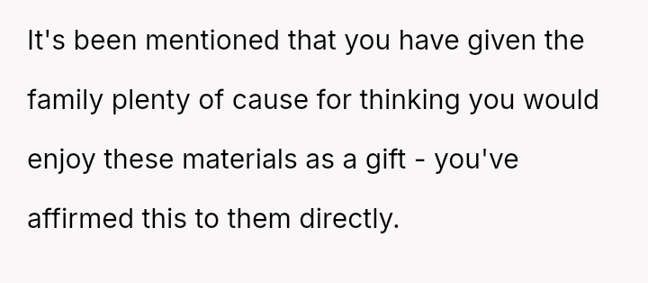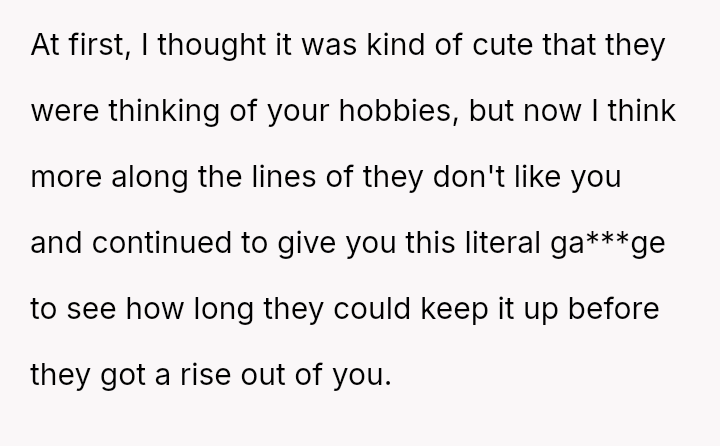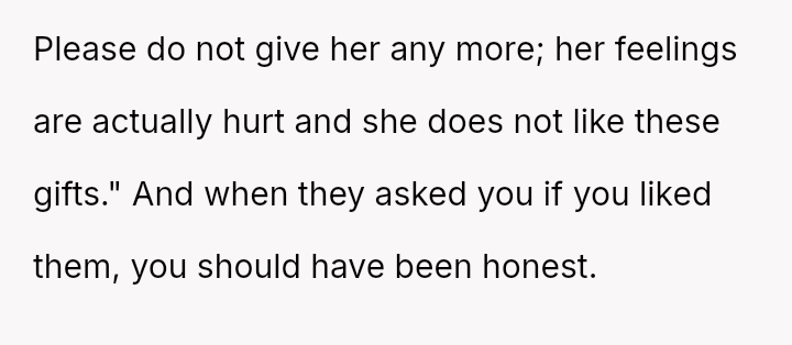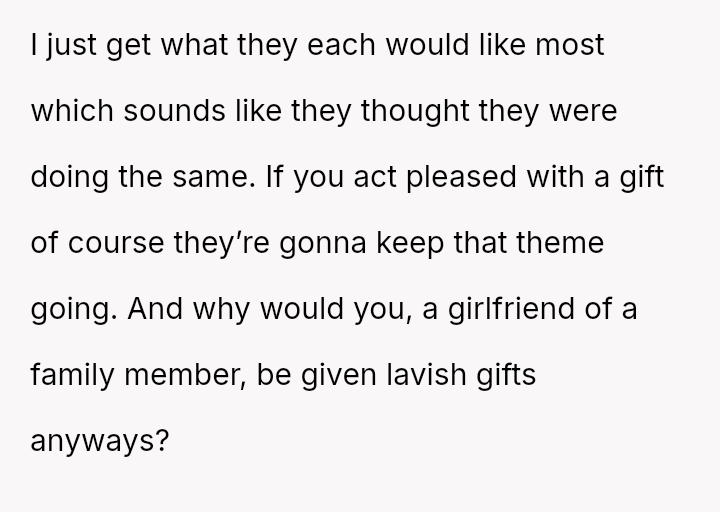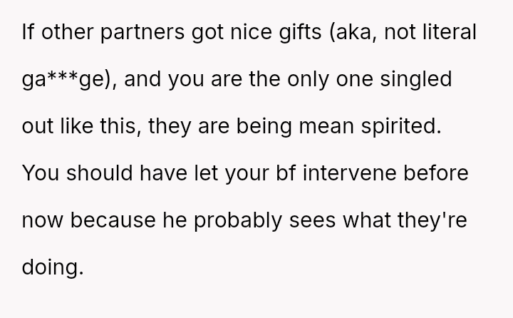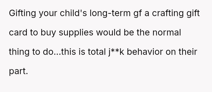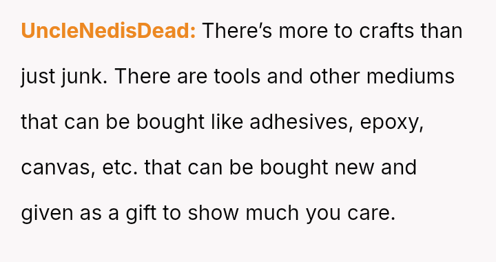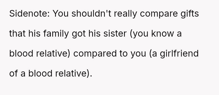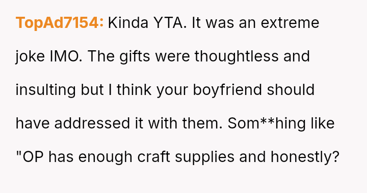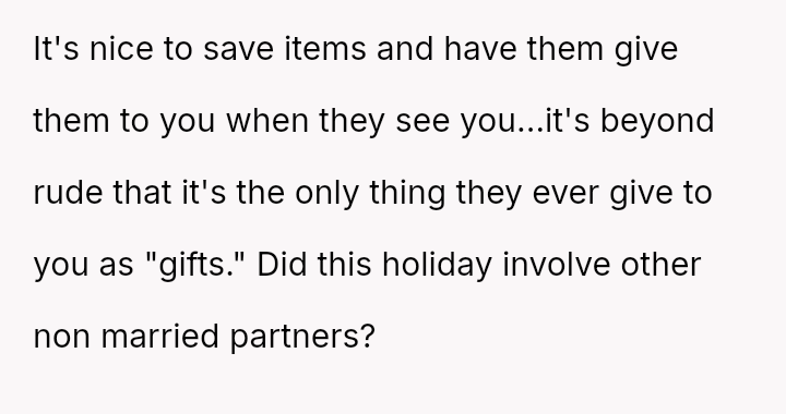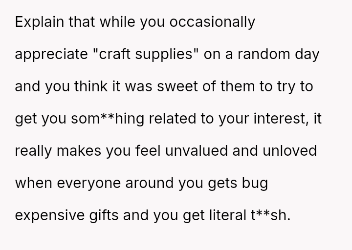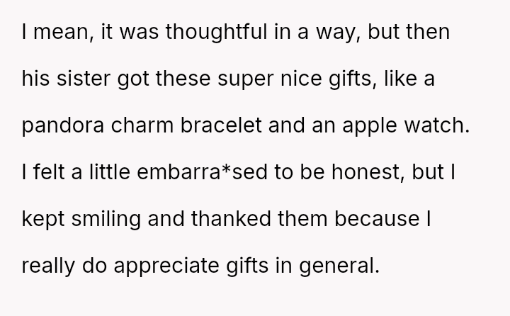 However, during a joint birthday party where the user received a bag of sc**p materials while her sister-in-law received expensive gifts, the user felt embarra*sed.