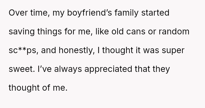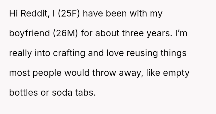 She enjoys crafting, particularly reusing materials like empty bottles and soda tabs, a hobby that her boyfriend's family initially supported by saving materials for her.