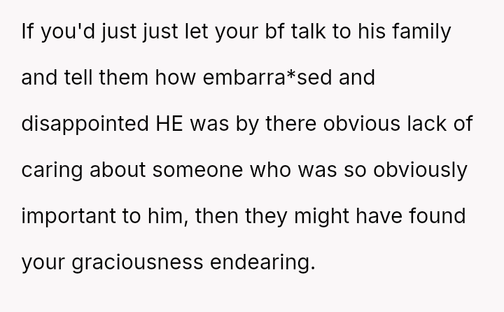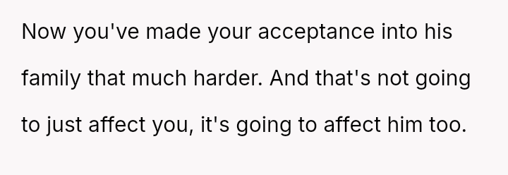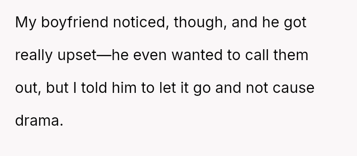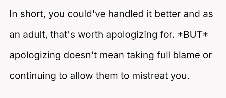 The user is currently experiencing conflict between her feeling of justified anger over what she perceived as deliberate insult from her boyfriend's family and the resulting negative fallout, especially after her sister-in-law accused her of cruelty.