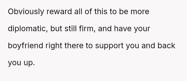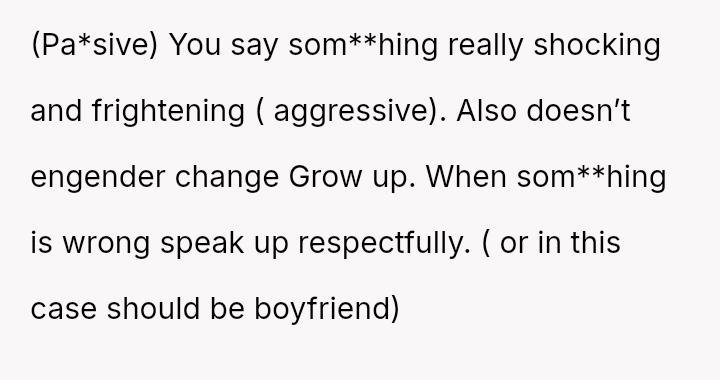 Her boyfriend supports her action, while she is beginning to doubt the extreme nature of her response.