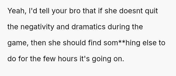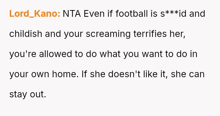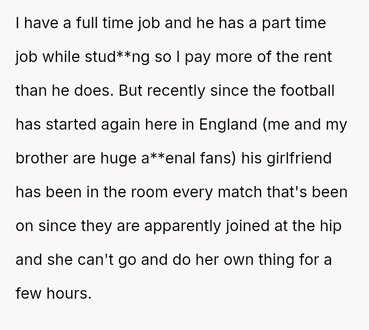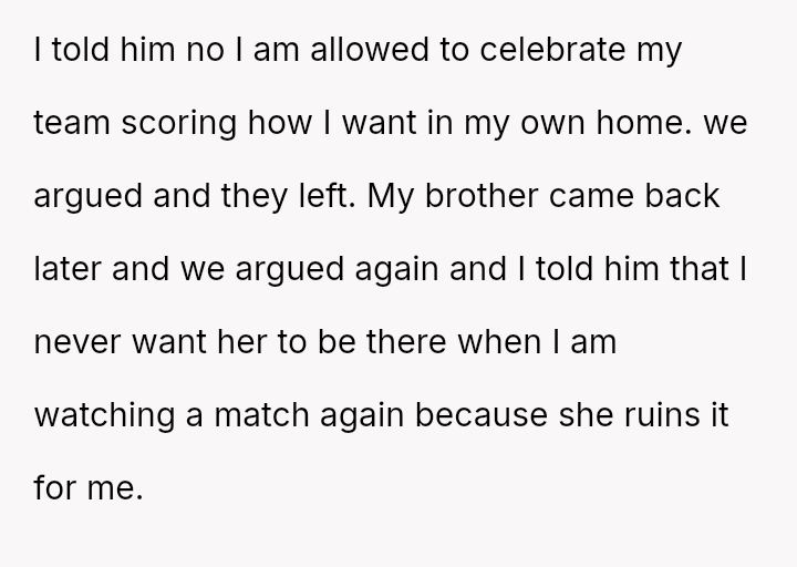 Should the OP enforce a strict boundary preventing the girlfriend from being present during matches to protect his enjoyment and emotional release, or does his obligation as a tenant in a shared home require him to moderate his behavior and expression to accommodate the comfort of his brother's partner?