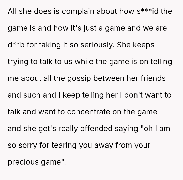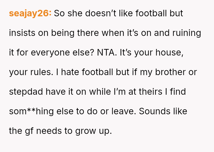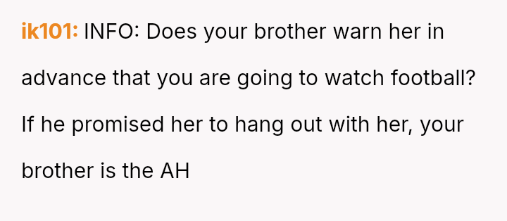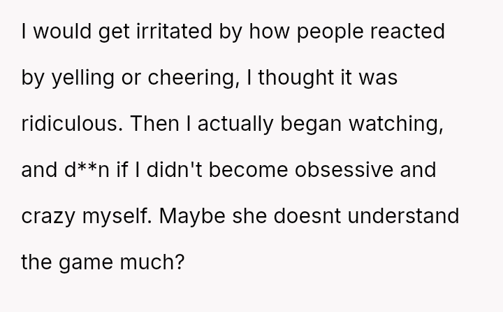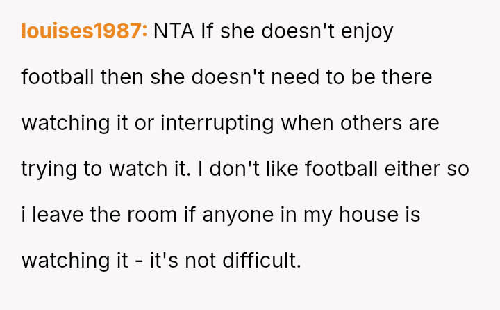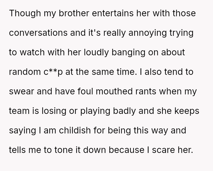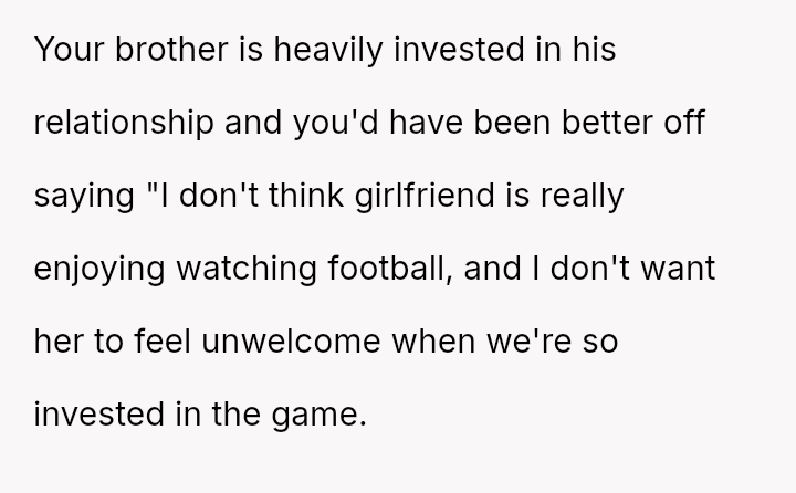 The OP feels his enjoyment and emotional expression related to football matches are being invalidated and interrupted by the girlfriend's persistent complaints and attempts at conversation, leading to a significant strain on his relationship with his brother.