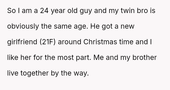 The original poster (OP) is facing a clear conflict between maintaining a personal space for an important hobby and maintaining peace within a shared living situation involving his twin brother and his brother's girlfriend.
