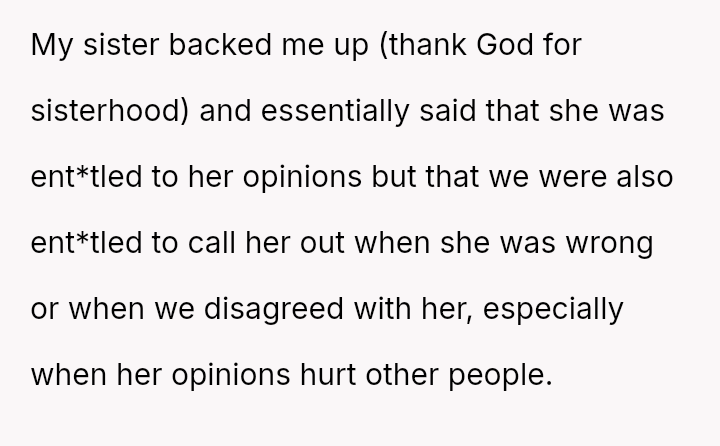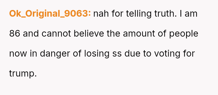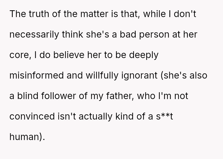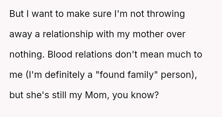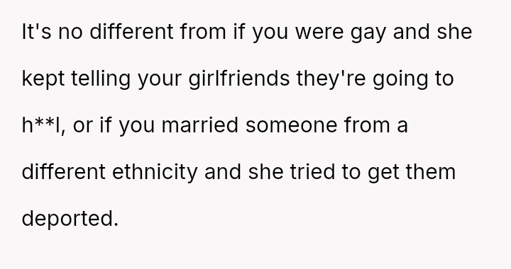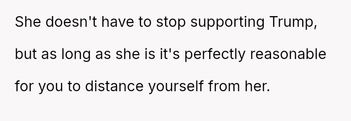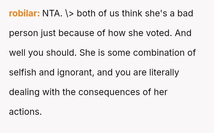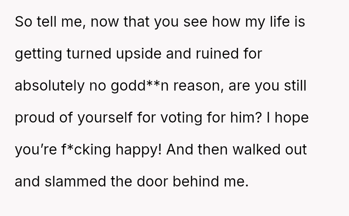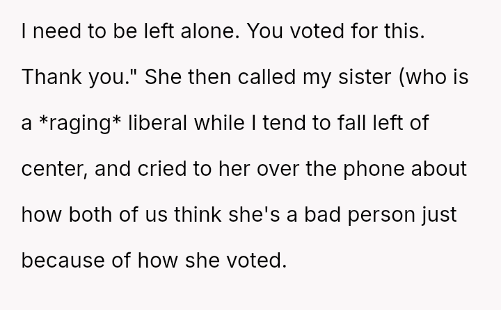This action resulted in an intense emotional reaction from the mother, who feels judged for her vote, creating a significant rift in their relationship.