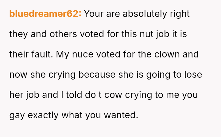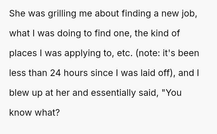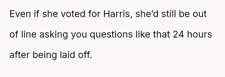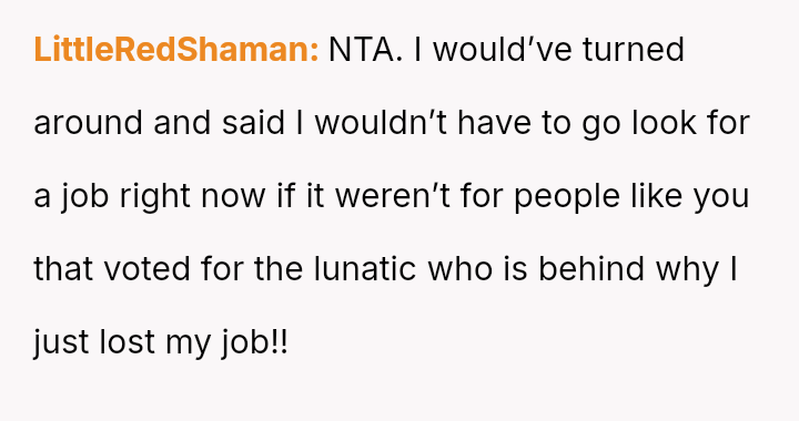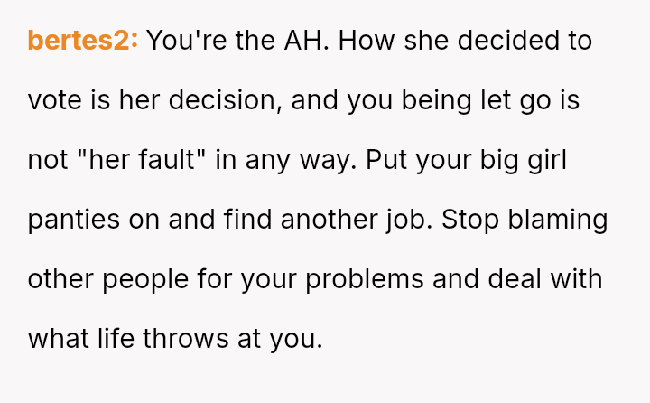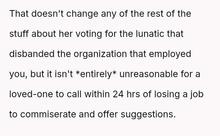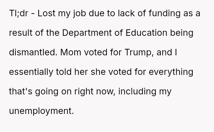 The original poster (OP) is facing the immediate crisis of job loss, which they directly link to the political choices of their mother.