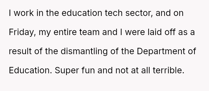 Laid off from his job in education tech due to the dismantling of the Department of Education, he faces not only financial uncertainty but the bitter sting of blame from those closest to him.