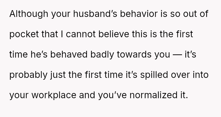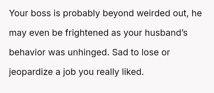 Her husband, concealing his true feelings, crossed a boundary by confronting her boss and upending the delicate balance she had worked so hard to create, leaving her caught between love and loyalty, trust and disappointment.