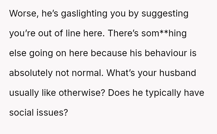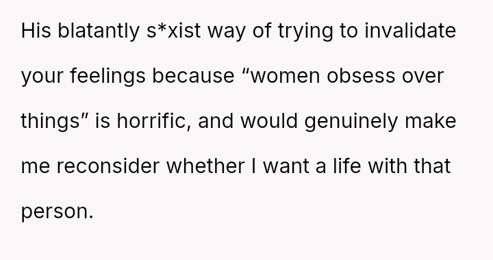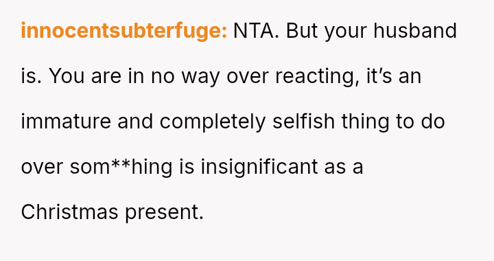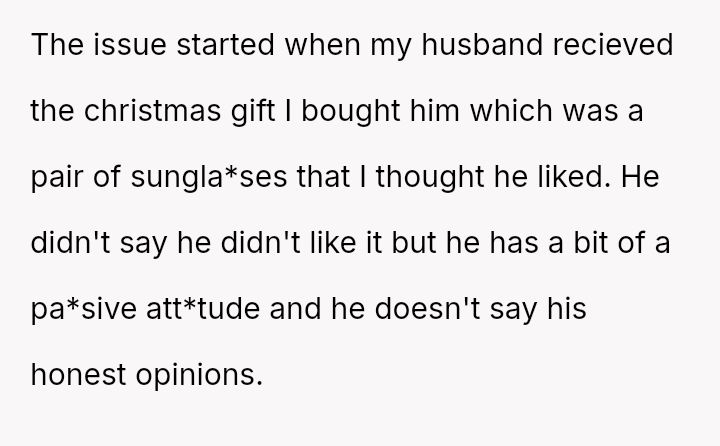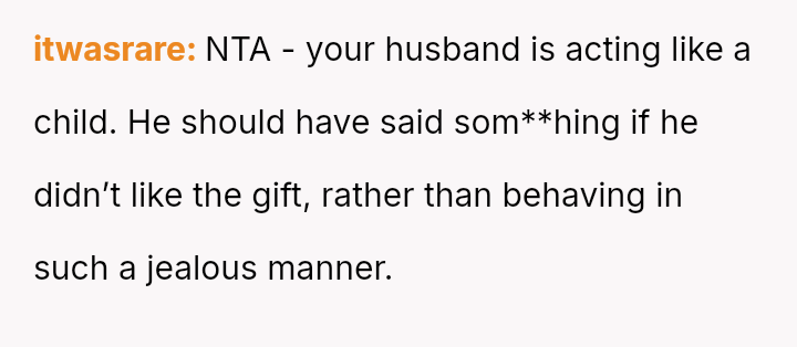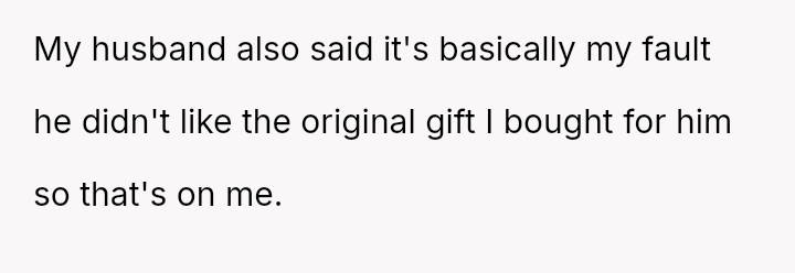 The husband dismisses her concerns, claiming the issue is minor and rooted in gendered differences regarding social etiquette, and further blames the OP for his dissatisfaction with his own gift.