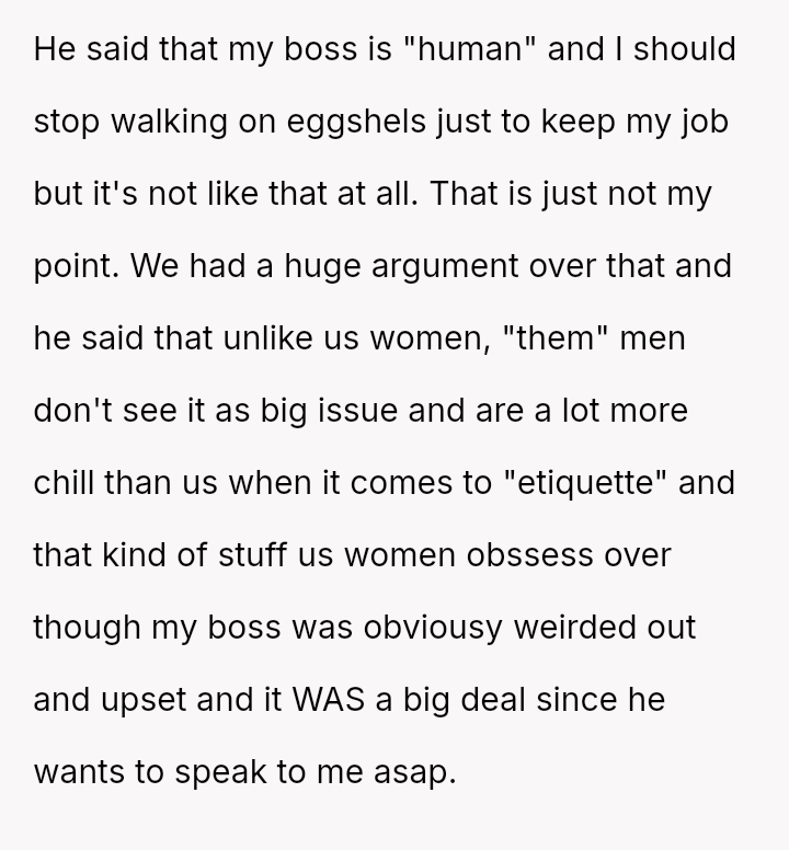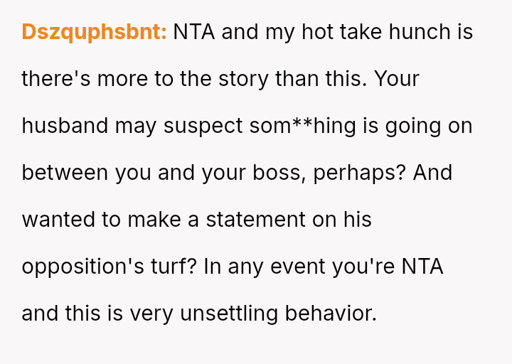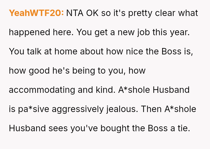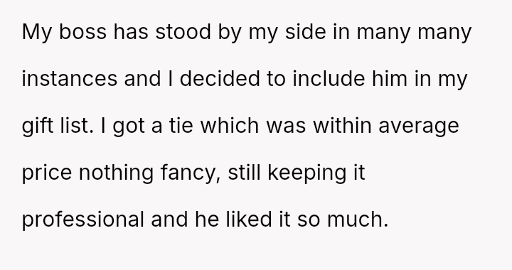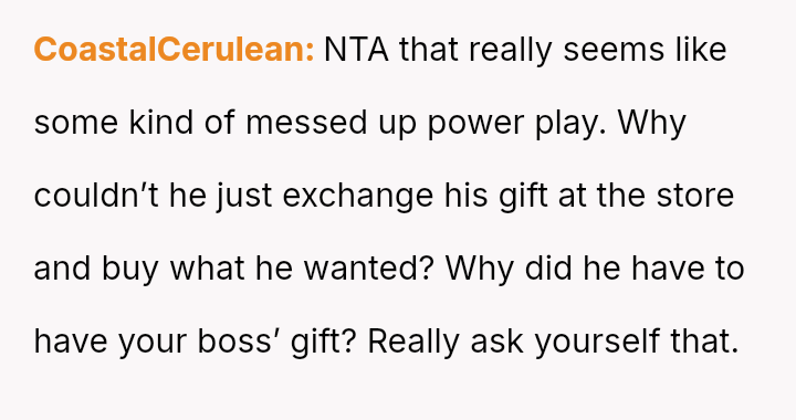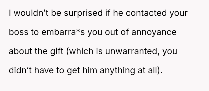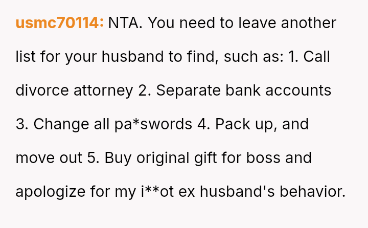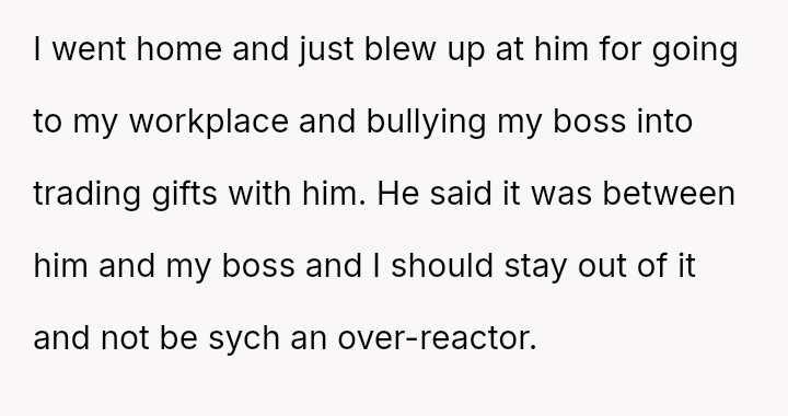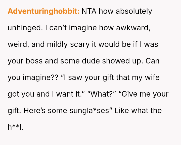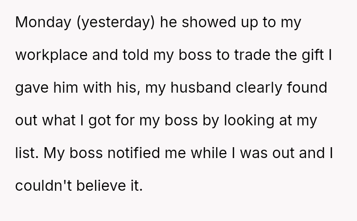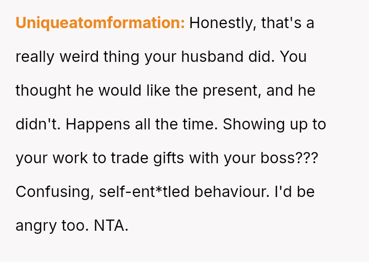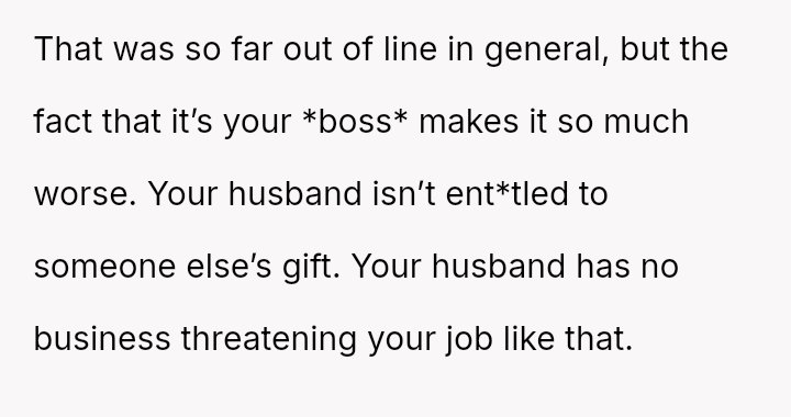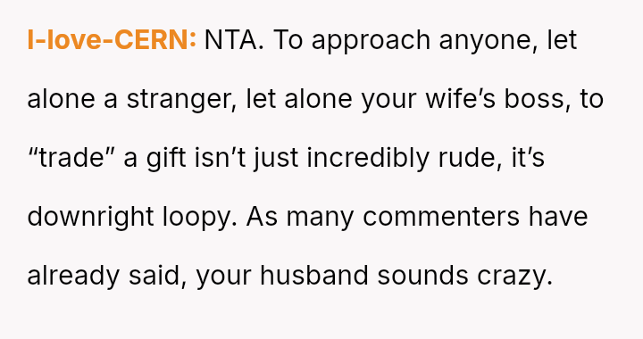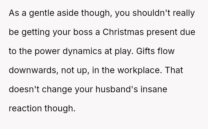 Was the husband justified in believing that the gift exchange was a private matter between him and the boss, or did his actions const*tute an inappropriate and damaging intrusion into the OP's professional sphere?