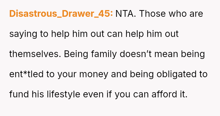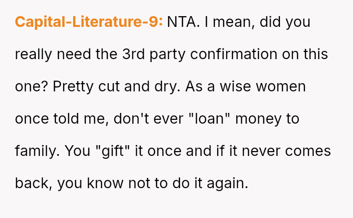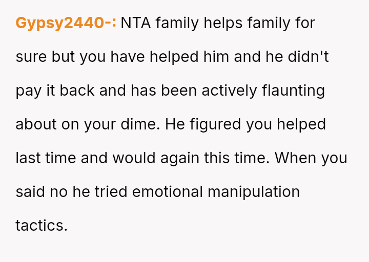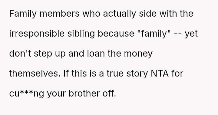 When a pattern of financial irresponsibility conflicts with a family member's right to protect their own resources, is the OP justified in refusing further loans and demanding repayment, or is the expectation of unconditional financial support within a sibling relationship more important?
