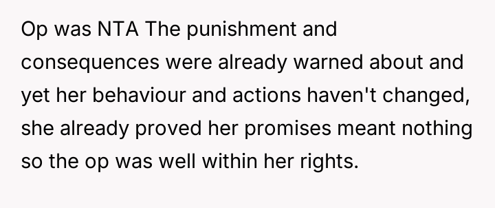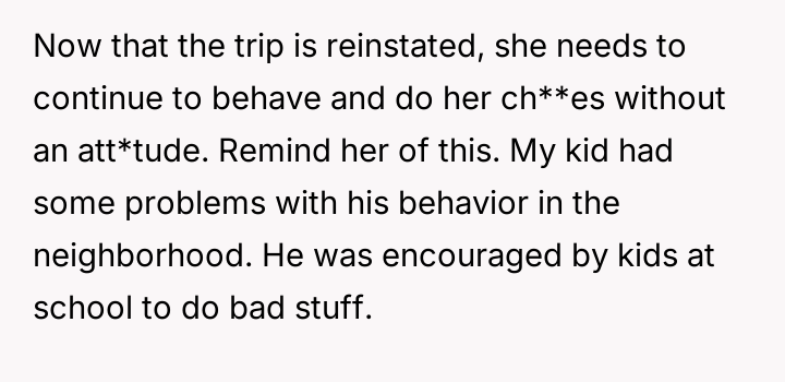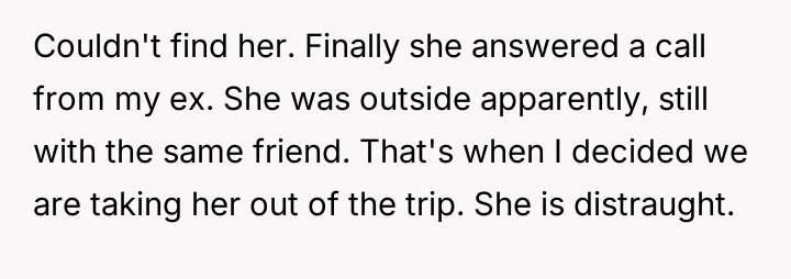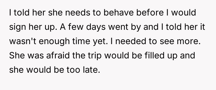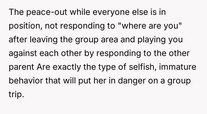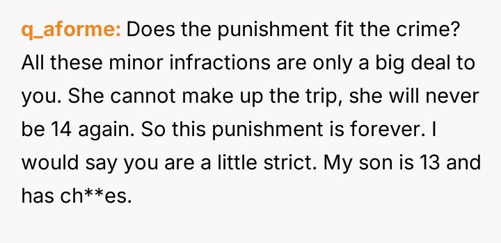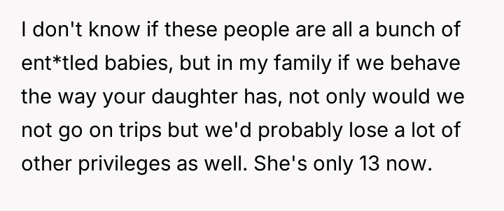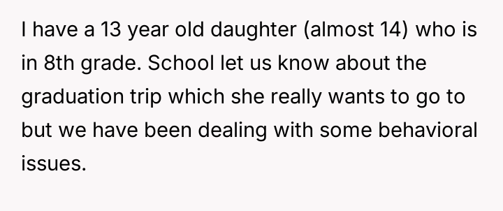 Was the parent justified in immediately withdrawing the daughter from the trip based on the v***ation of trust and prior behavioral agreements, or did this response create an unnecessarily harsh consequence for a 13-year-old's lapse in judgment?