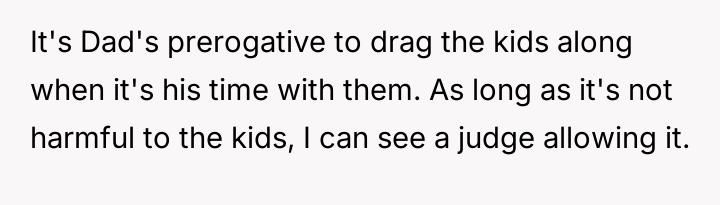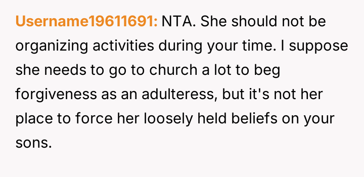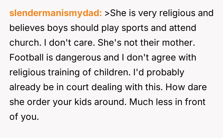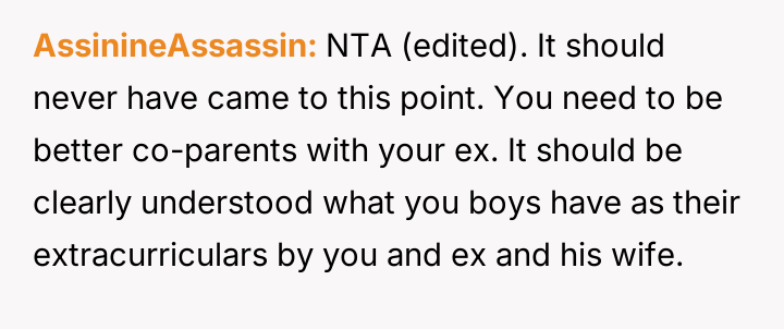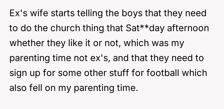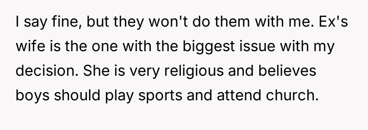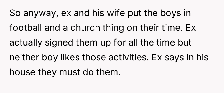 The original poster (OP) is facing a direct conflict regarding parenting decisions that cross over between households, specifically concerning extracurricular activities scheduled during their court-ordered time.
