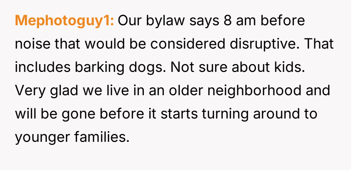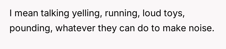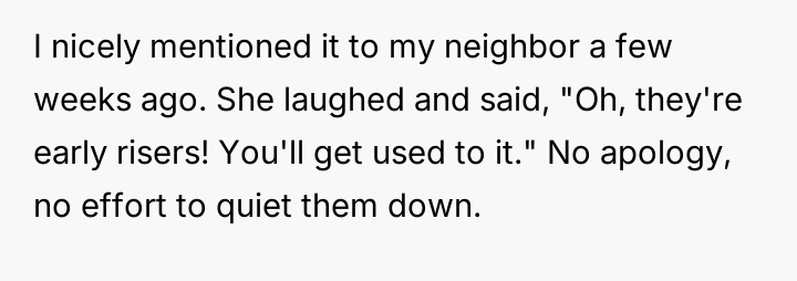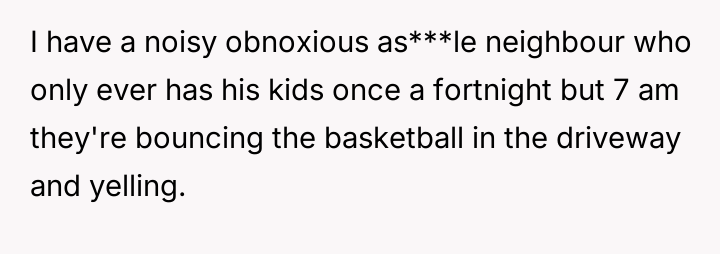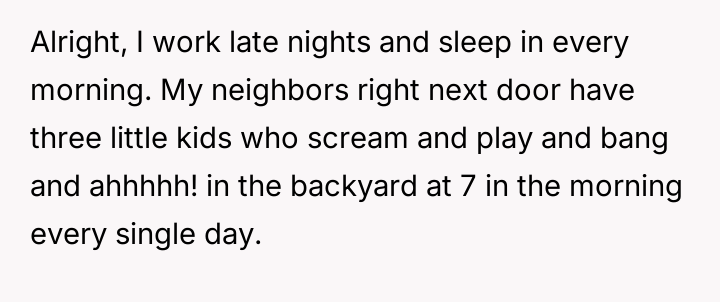 However, the next-door neighbors have three young children who frequently make loud noises, such as screaming, playing, and banging in the backyard starting around 7:00 AM daily, including weekends.