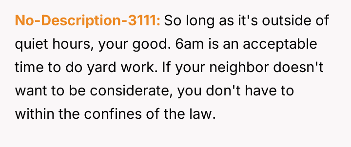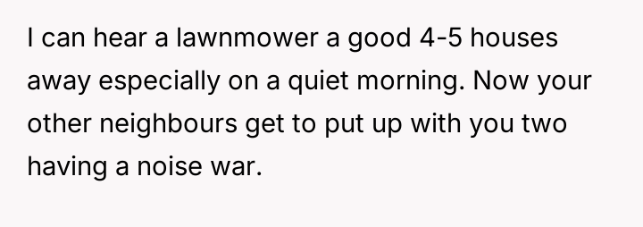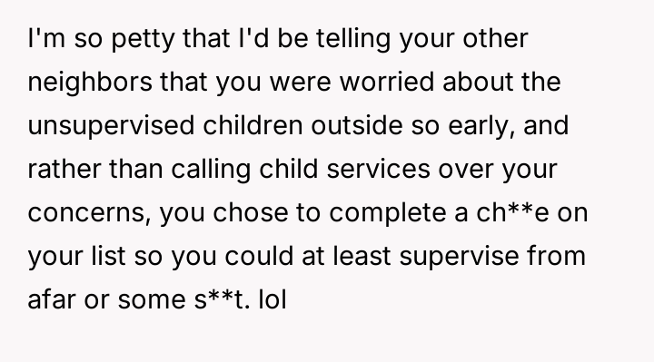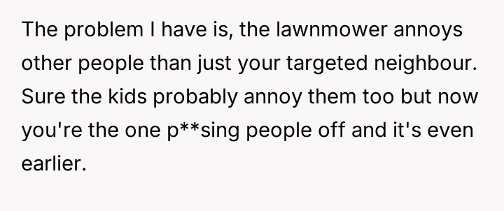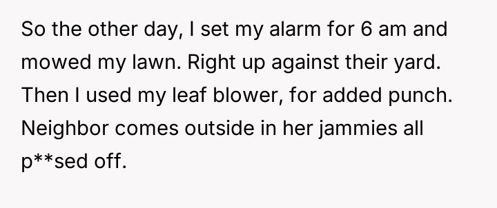 After politely asking the neighbor to quiet the children, who responded dismissively by saying the OP would get used to it, the OP decided to retaliate by mowing their lawn and using a leaf blower right next to the shared property line starting at 6:00 AM.