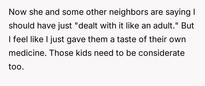 When confronted by the upset neighbor, the OP mirrored her previous statement, leading to conflict with the neighbor and other community members who suggest the OP should have handled the situation differently, leaving the OP to question if their actions were justified.