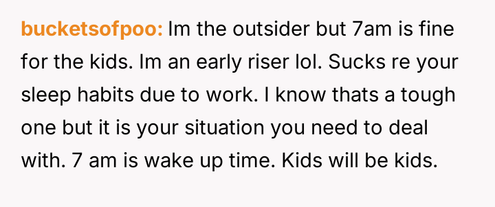The original poster is experiencing frustration due to a significant disruption of their required sleep schedule caused by the neighbors' children's early morning activities.