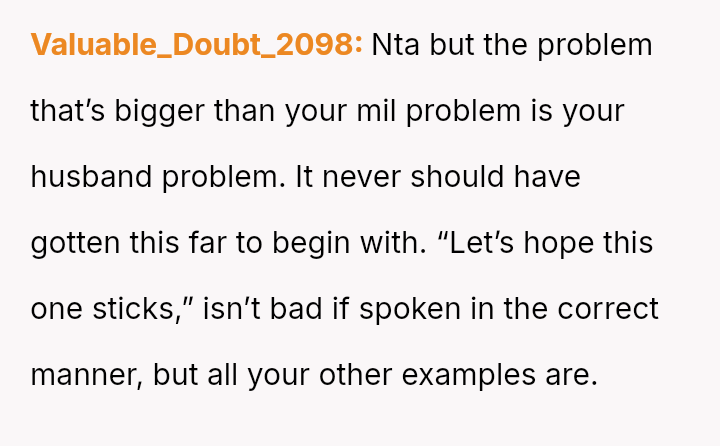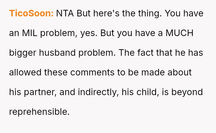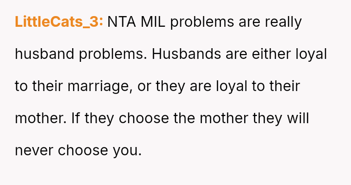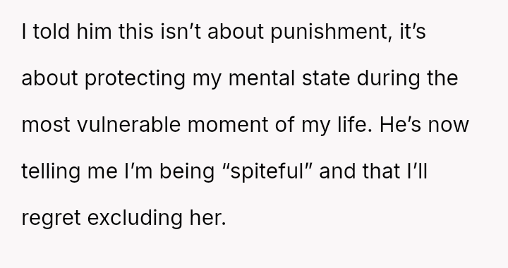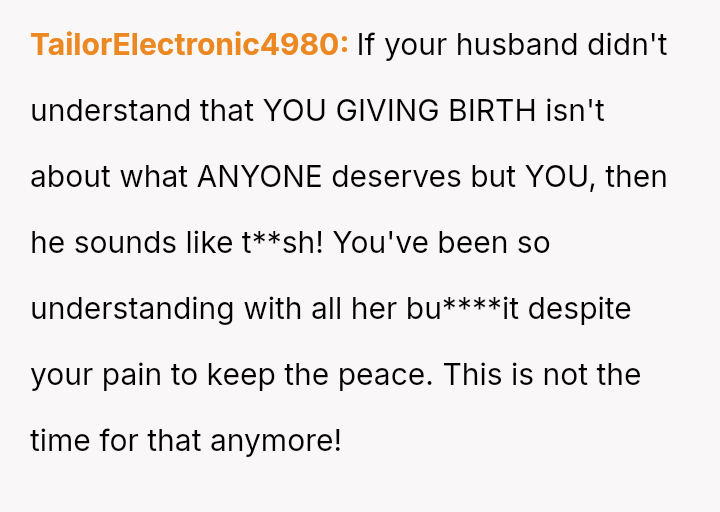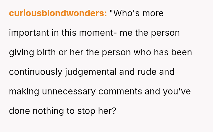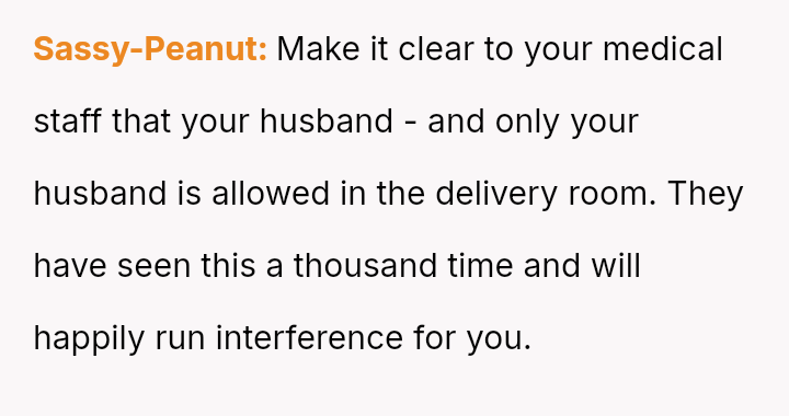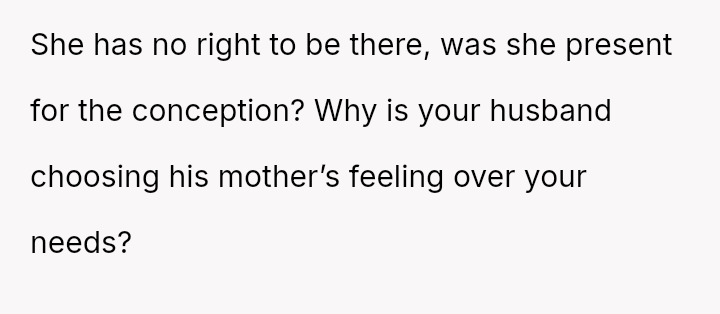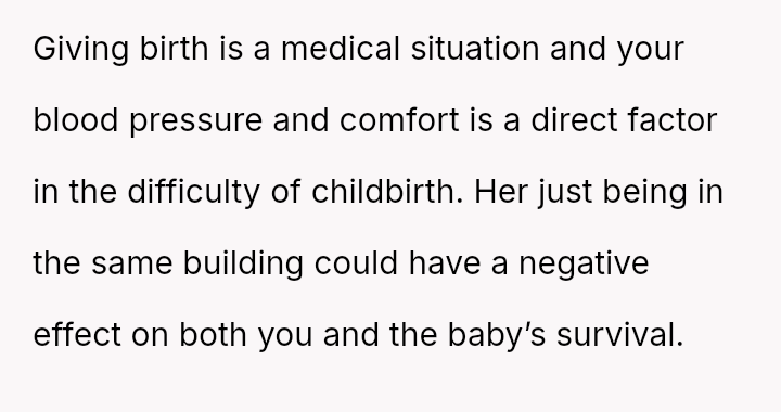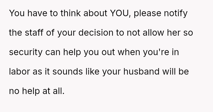Her decision to exclude the MIL from the delivery room stems from a need for a safe environment, directly conflicting with her husband's desire to include his mother immediately upon the baby's birth, framing the exclusion as punitive rather than protective.