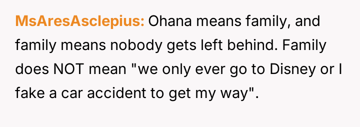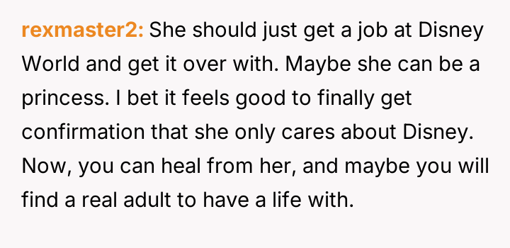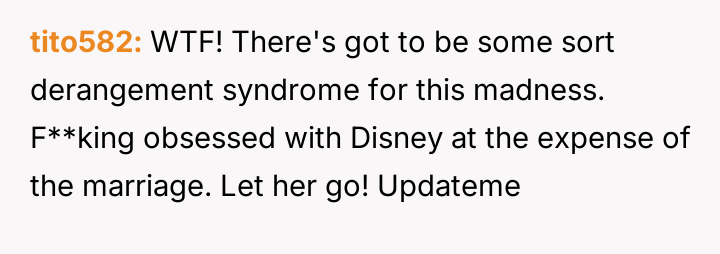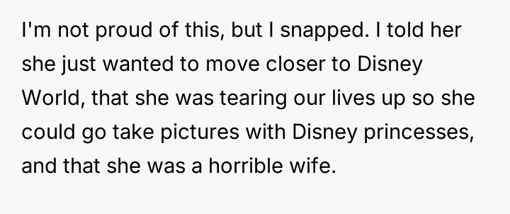 The original poster (OP) is deeply frustrated and feels betrayed by his wife's persistent focus on Disney-related activities, culminating in a demand to move across the country based on questionable pretenses regarding her parents and employment.