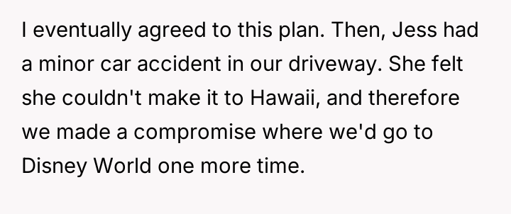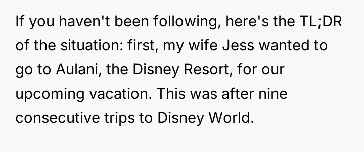 [Actual Final Update] My wife only wants to go to Disney World for our vacations