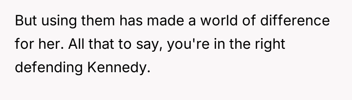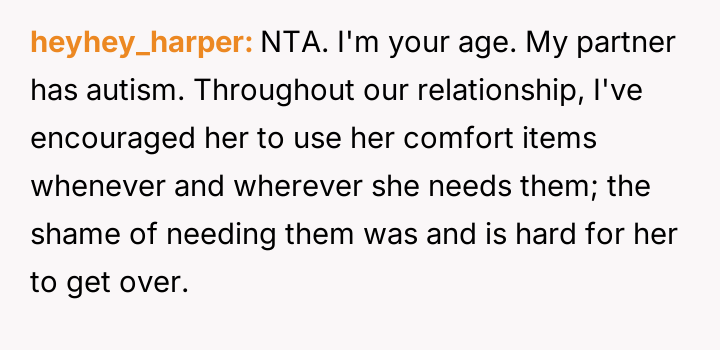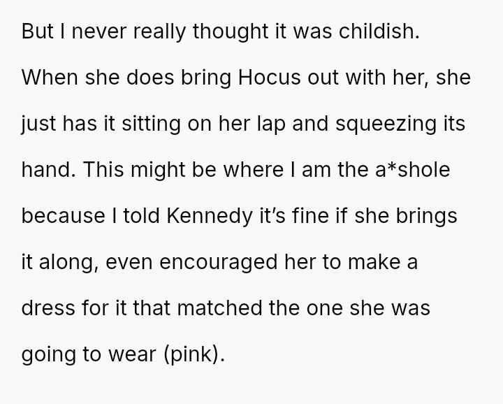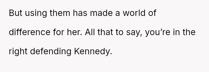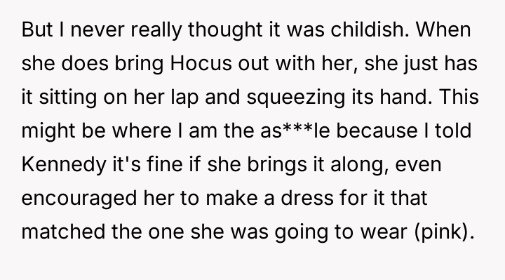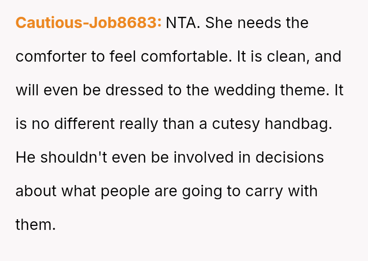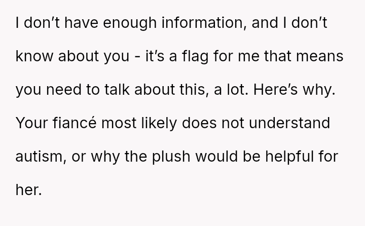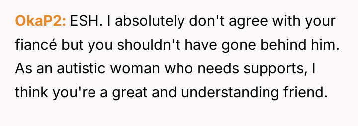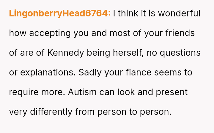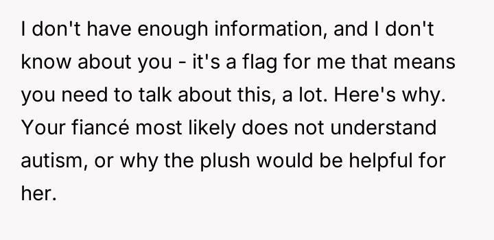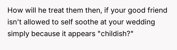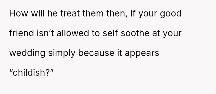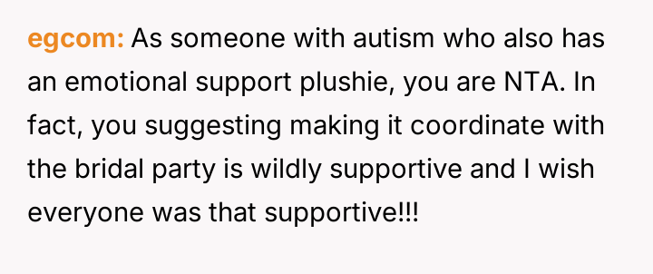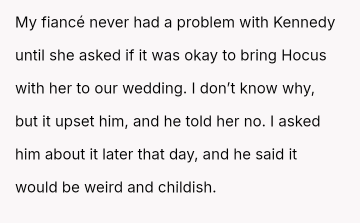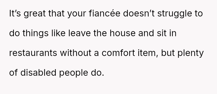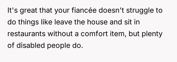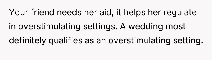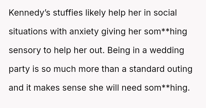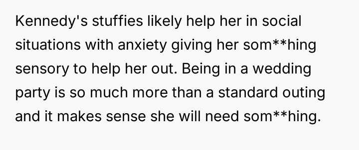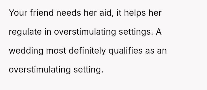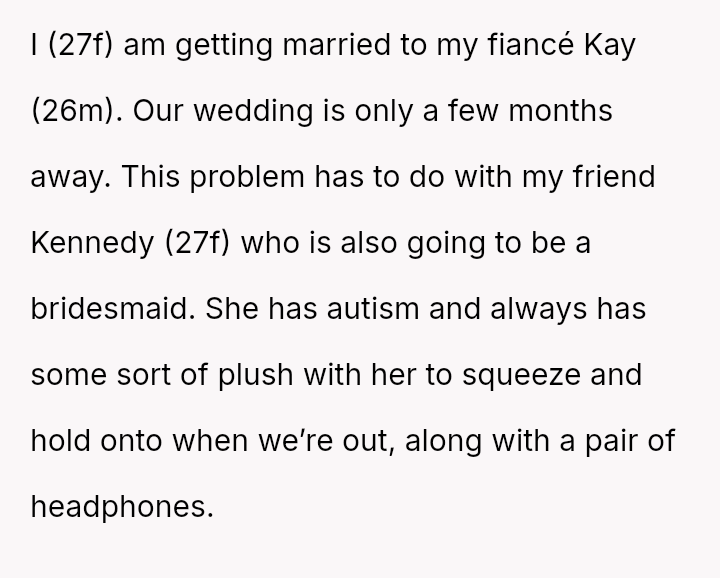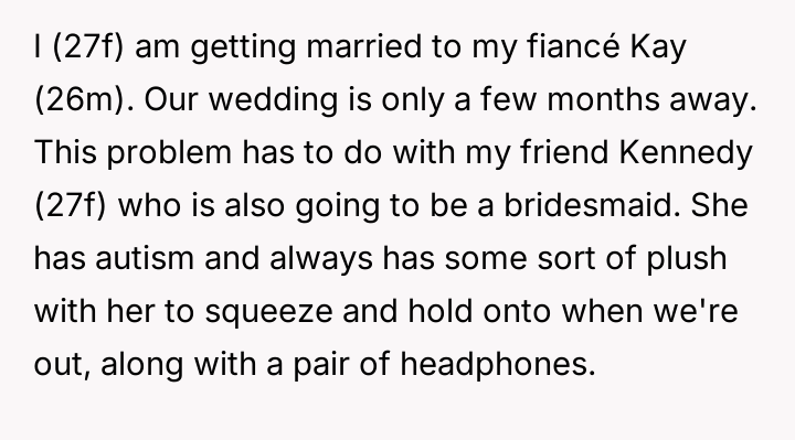 The original poster (OP) finds herself in a difficult position, balancing her loyalty to her friend Kennedy, who relies on a comfort item due to autism, against the strong objections of her fiancé, Kay, who finds the item inappropriate for the wedding setting.