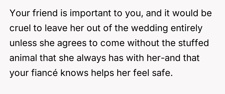 AITA for allowing my friend to bring her stuffed animal to me and my fiancés wedding?