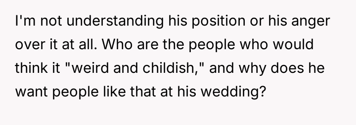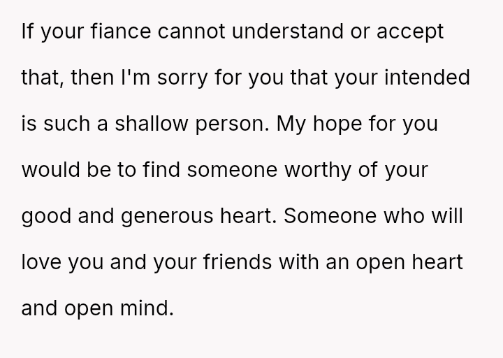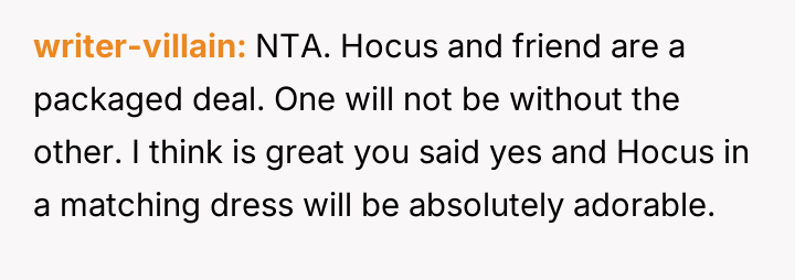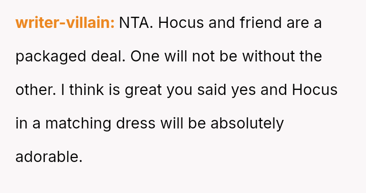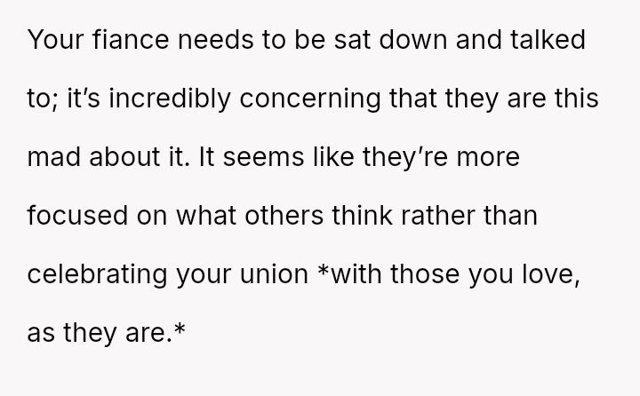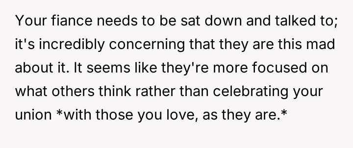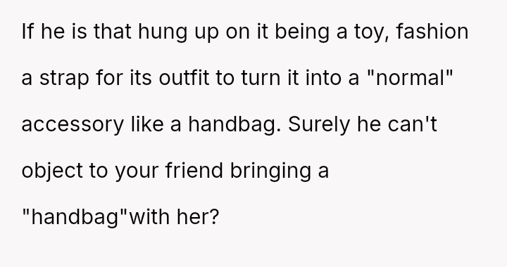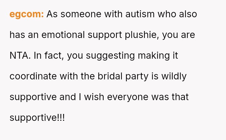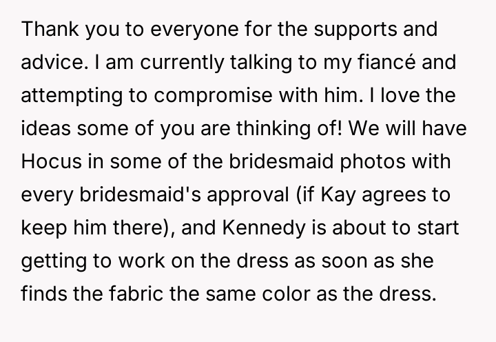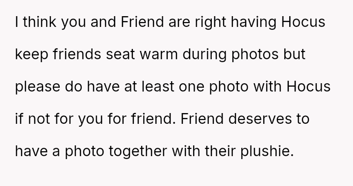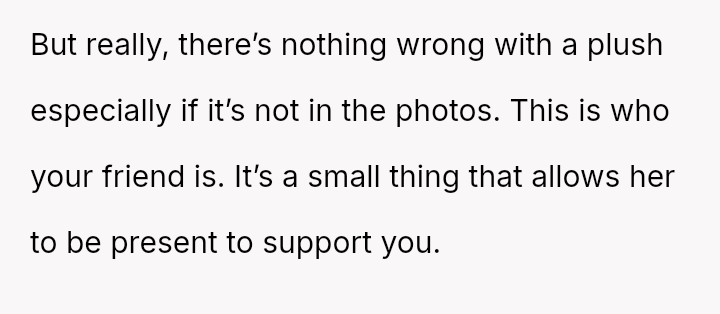 Considering the importance of both the friend's comfort and the fiancé's vision for the wedding day, is the compromise of including the plush in select photos a fair resolution, or does one party's need for control or comfort outweigh the other in the context of their marriage celebration?