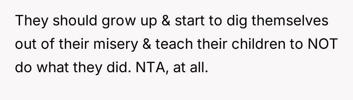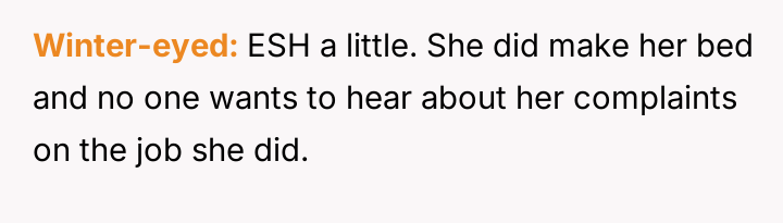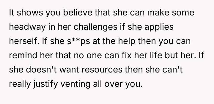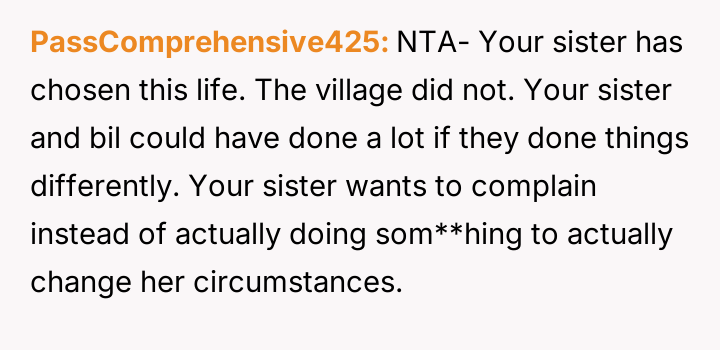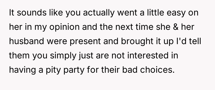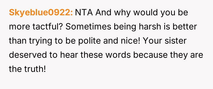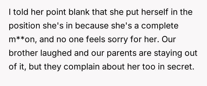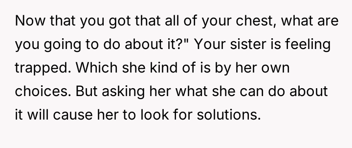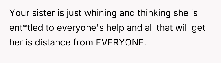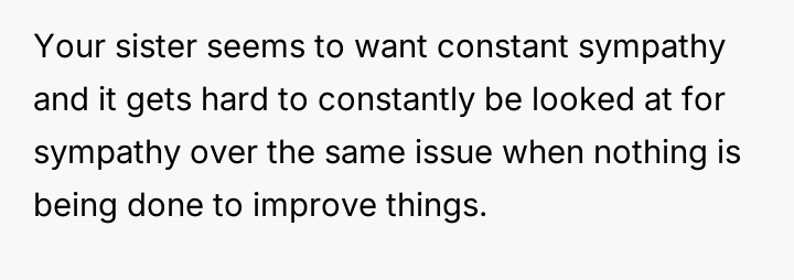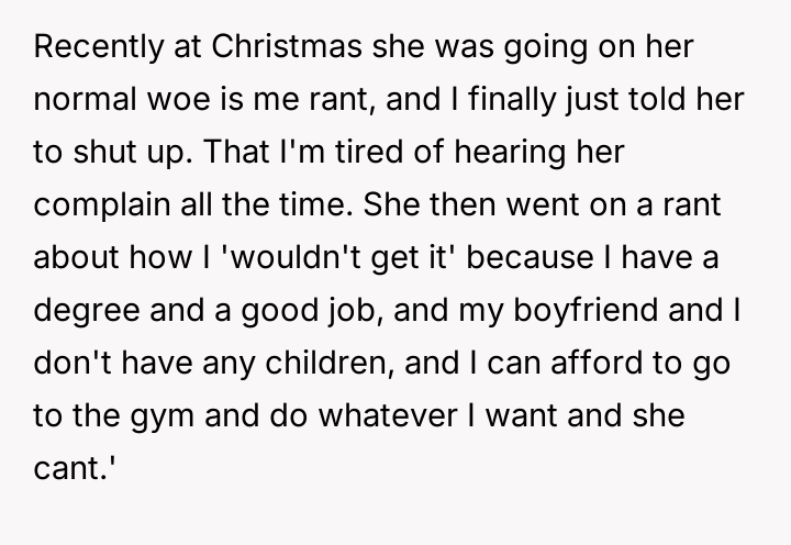 The OP grew tired of these constant complaints, especially when the sister contrasted her own life with the OP's career and relationship s**bility, leading the OP to tell her sister off harshly, questioning her life choices.