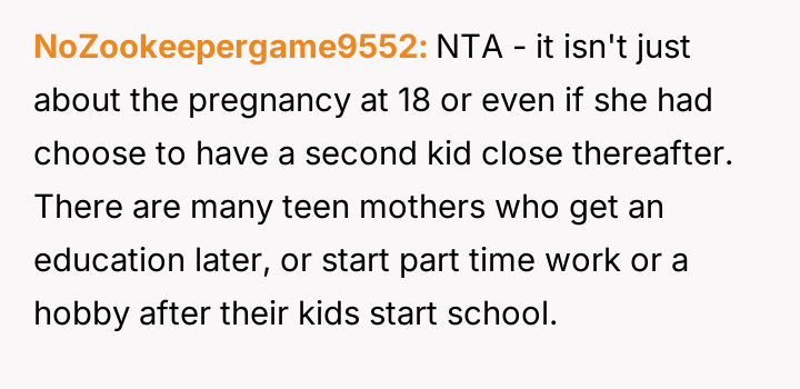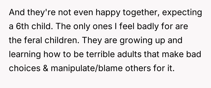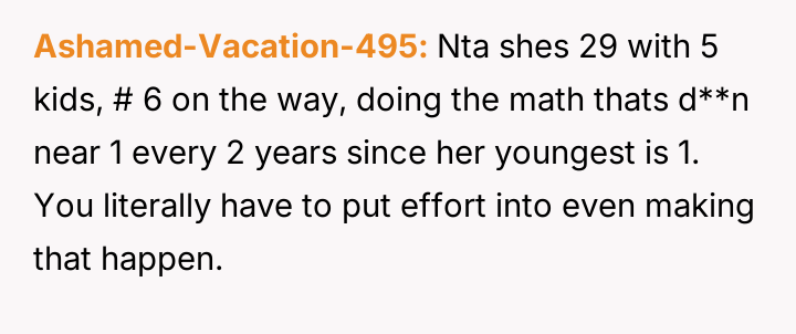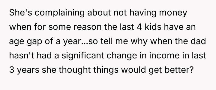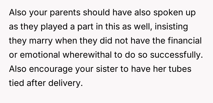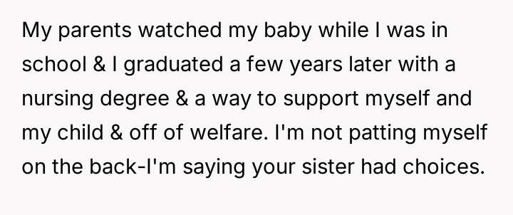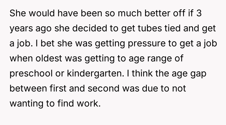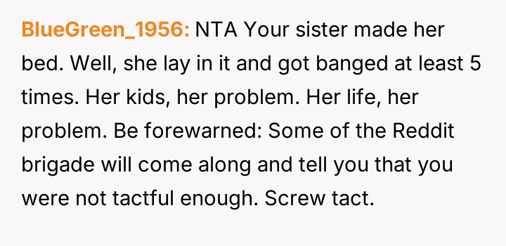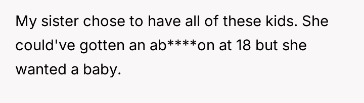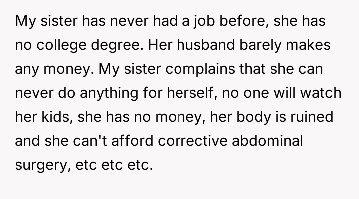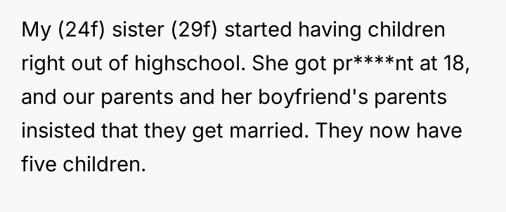 The original poster (OP), a 24-year-old woman, describes her relationship with her 29-year-old sister, who started having children right after high school. The sister now has five children ranging in age from one to eleven. The sister has never held a job, lacks a college degree, and her husband earns very little money.