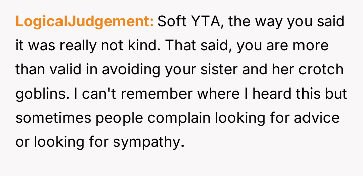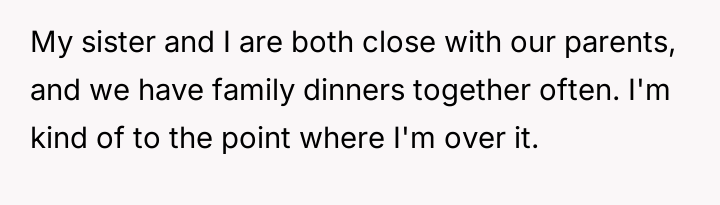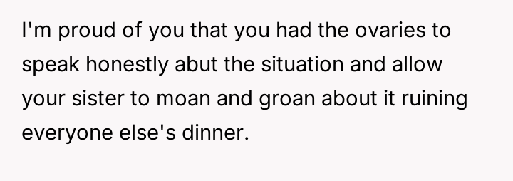 The OP feels justified in her outburst due to the repet*tive nature of the complaints, while the sister feels deeply hurt and publicly betrayed by her family's lack of support.