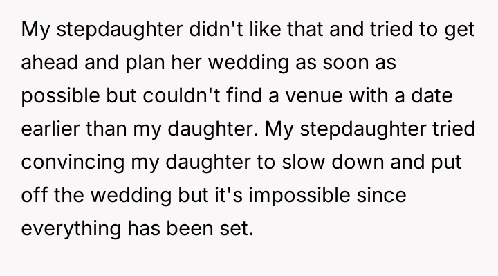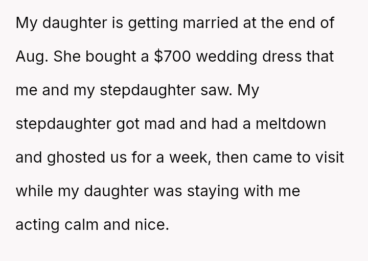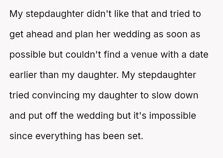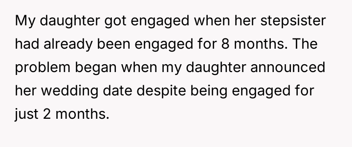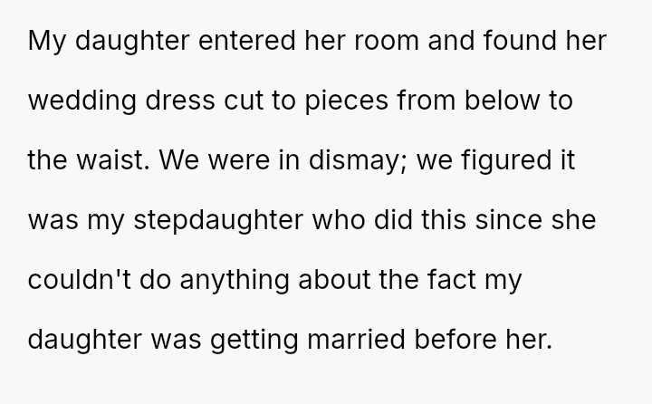 The central conflict revolves around the stepdaughter's inability to accept that her sister achieved a significant life milestone (setting a wedding date) before her, leading to an act of severe vandalism born out of spite.