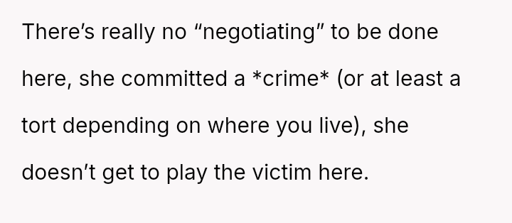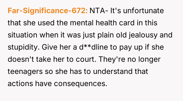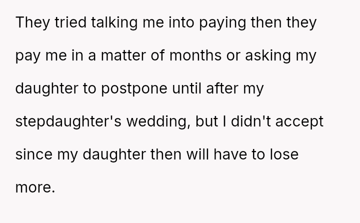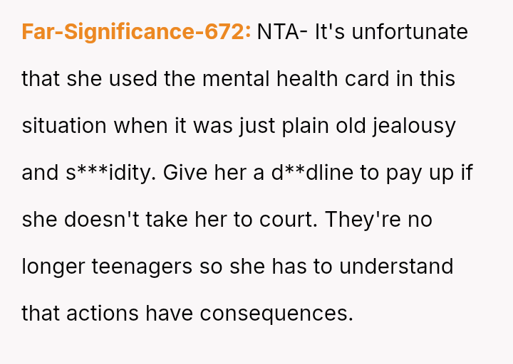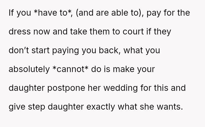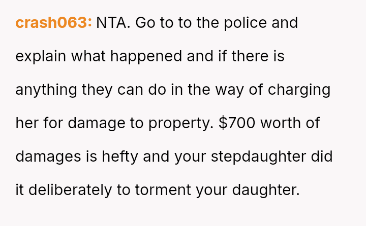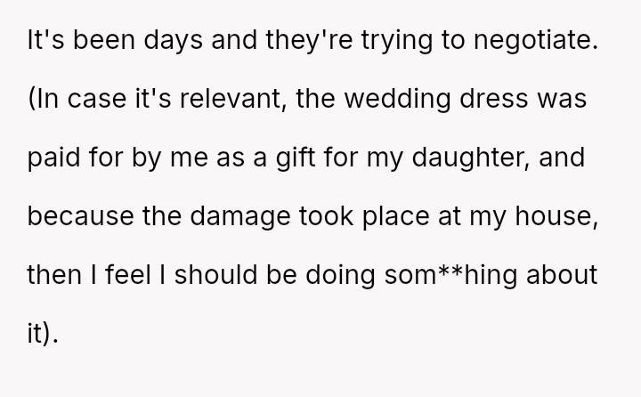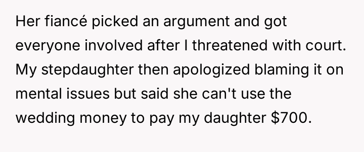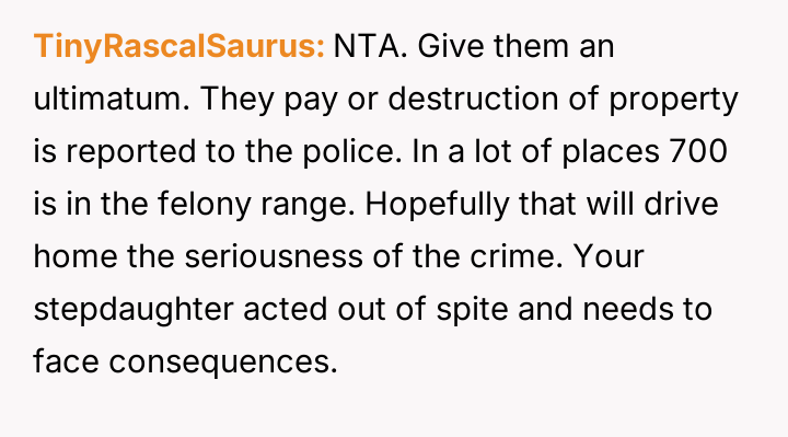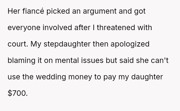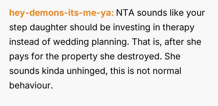 Is the mother justified in immediately demanding repayment for the destroyed property and escalating the issue, or should she prioritize the stepdaughter's admitted mental health struggles and negotiate a payment plan, potentially sacrificing her own daughter's timeline for wedding s**bility?