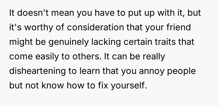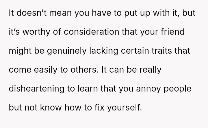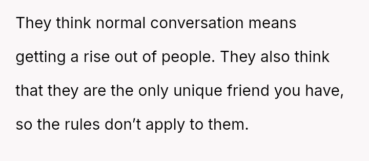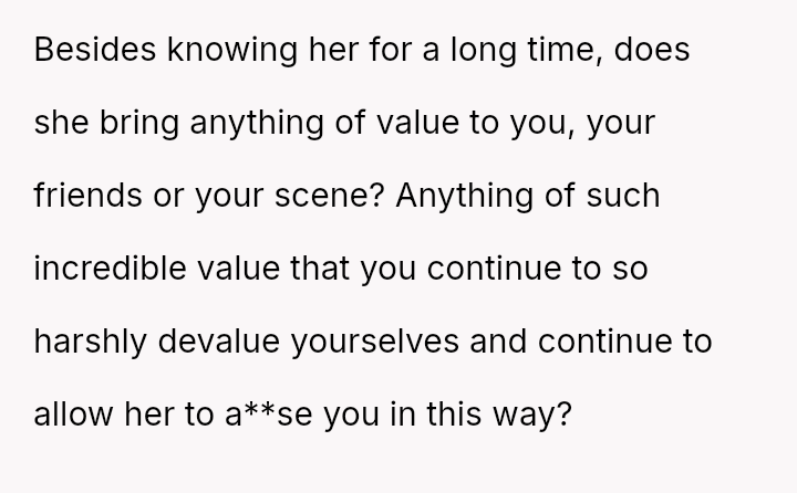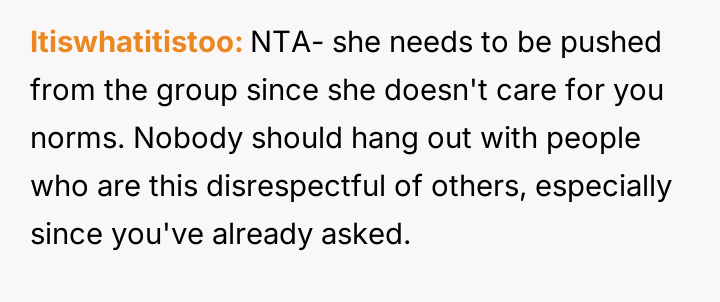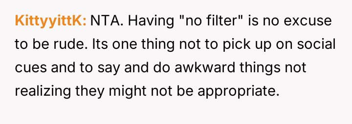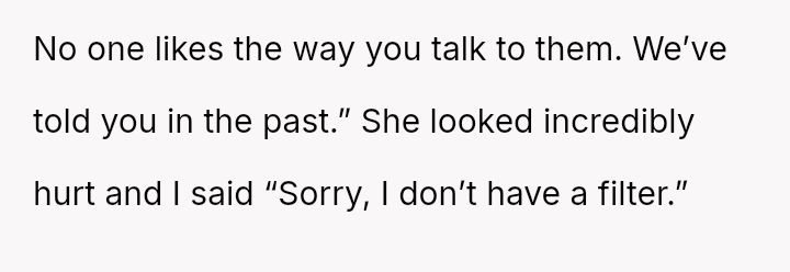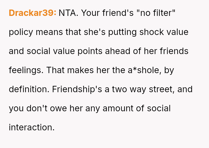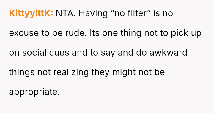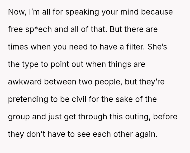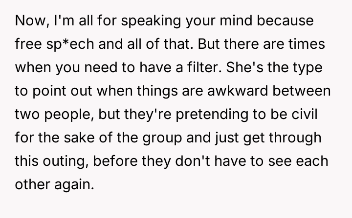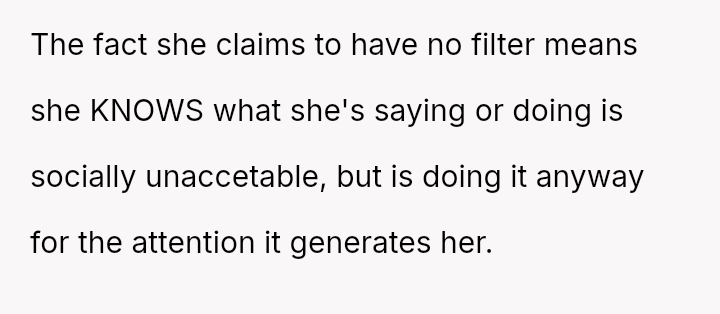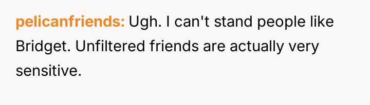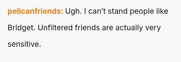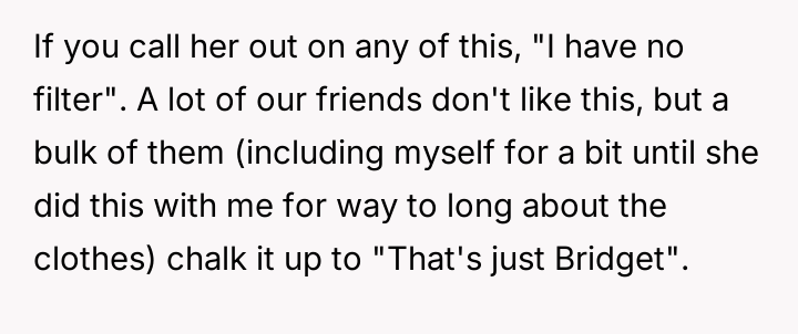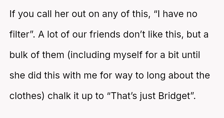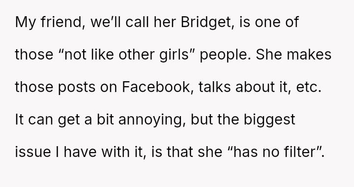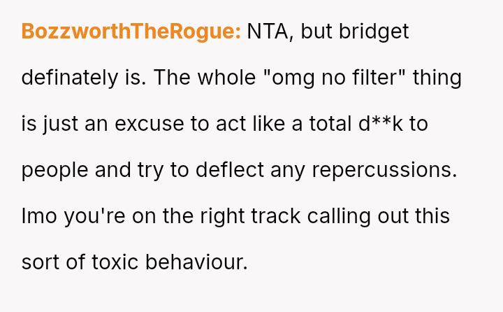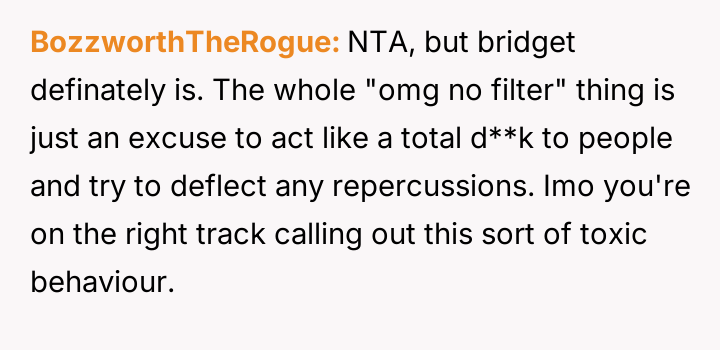 Given the pattern of behavior where Bridget uses 'no filter' as a justification for actions that consistently make others uncomfortable, is the OP justified in prioritizing the group's comfort by issuing a firm ultimatum, or did the OP cross a line by confronting Bridget so harshly, potentially damaging a long-term friendship?