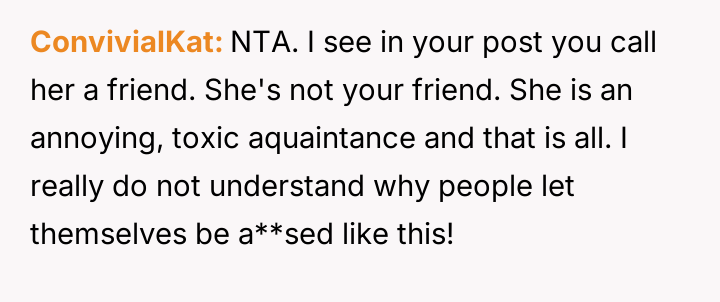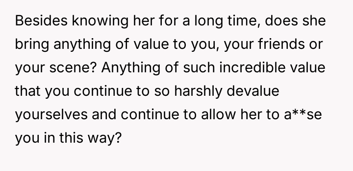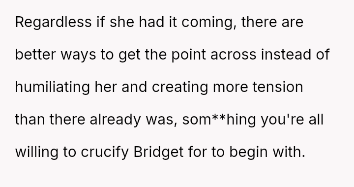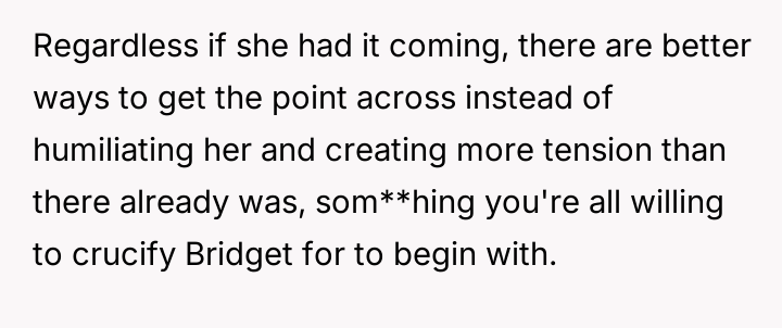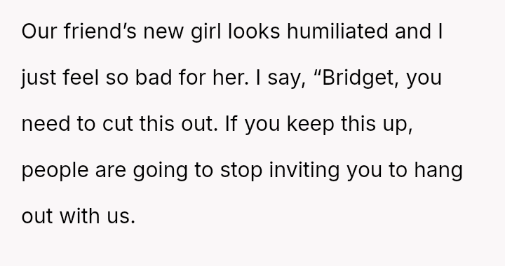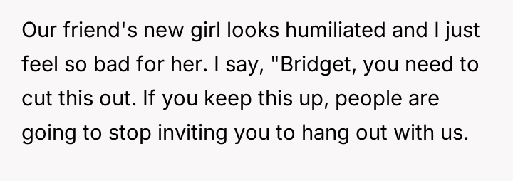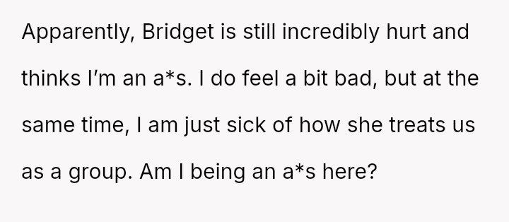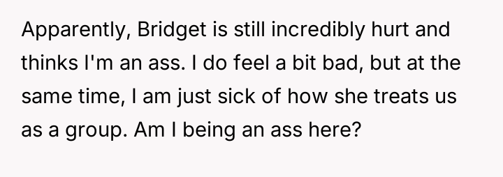 The OP finally confronted Bridget directly about this persistent behavior, which caused Bridget significant emotional distress and has now led to conflict between the two friends.