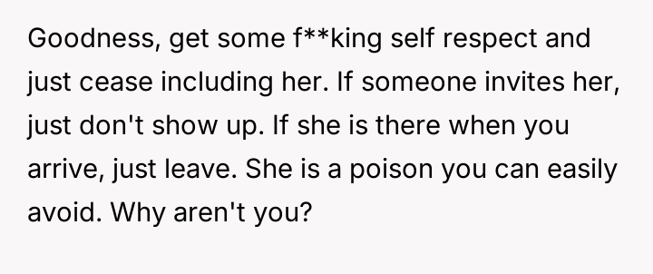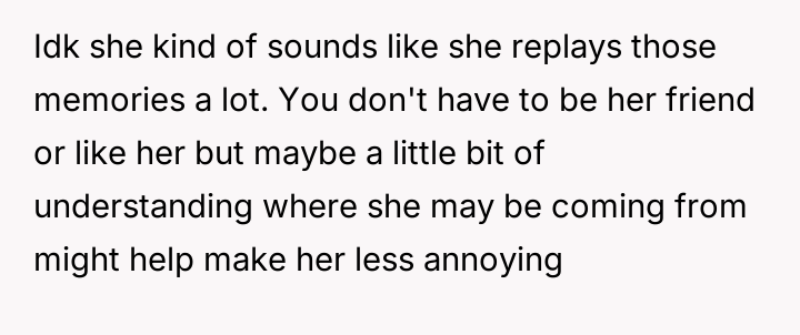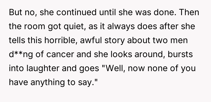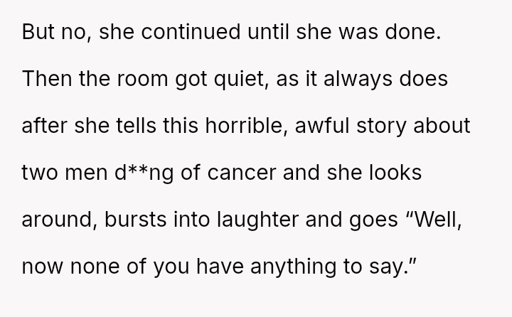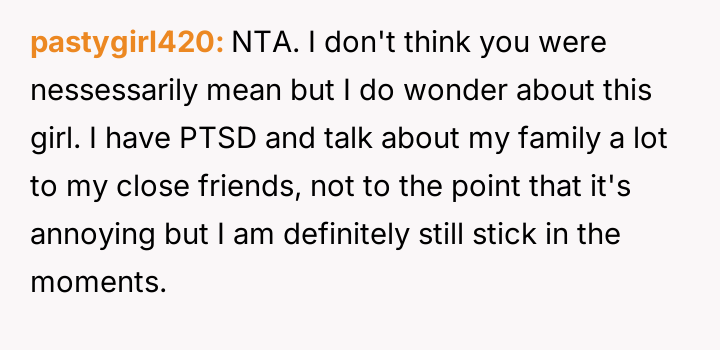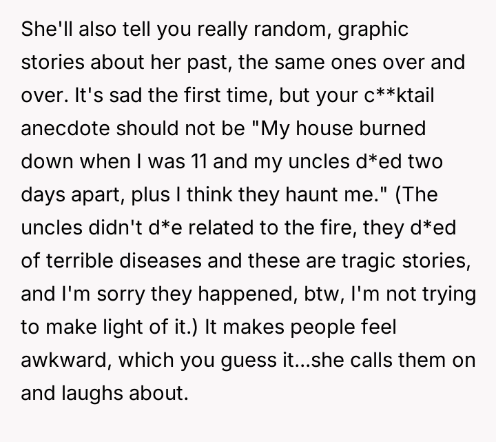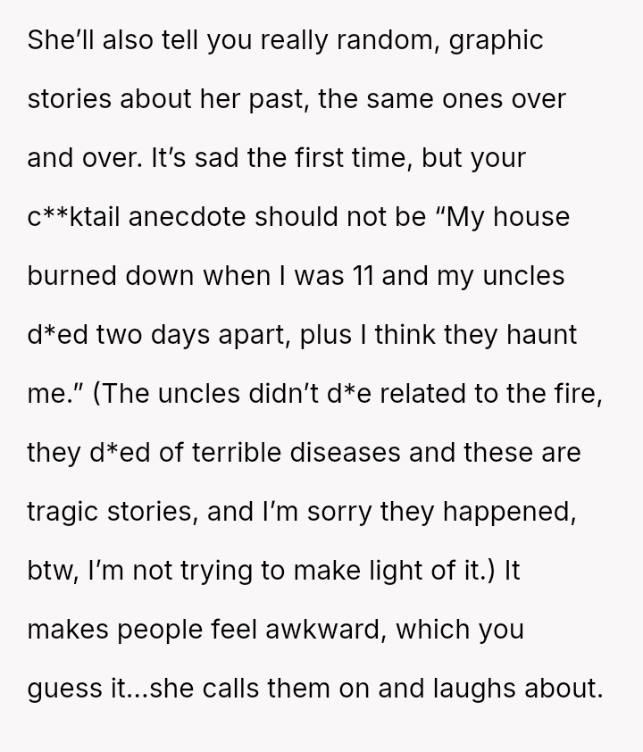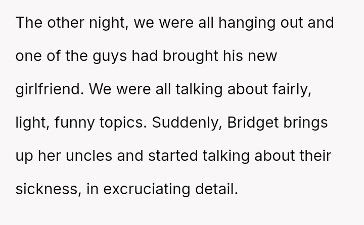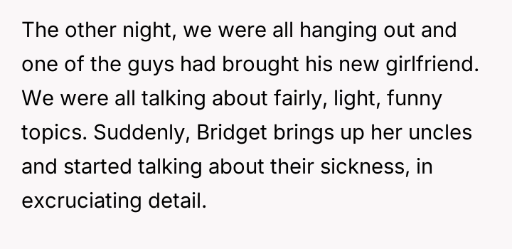 The original poster (OP) reached a breaking point after witnessing their friend, Bridget, repeatedly cause discomfort by sharing excessively graphic personal trauma and criticizing others without restraint, culminating in an incident where Bridget intentionally deflated a positive social atmosphere with a graphic story, resulting in the new girlfriend feeling humiliated.