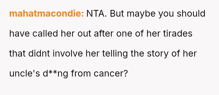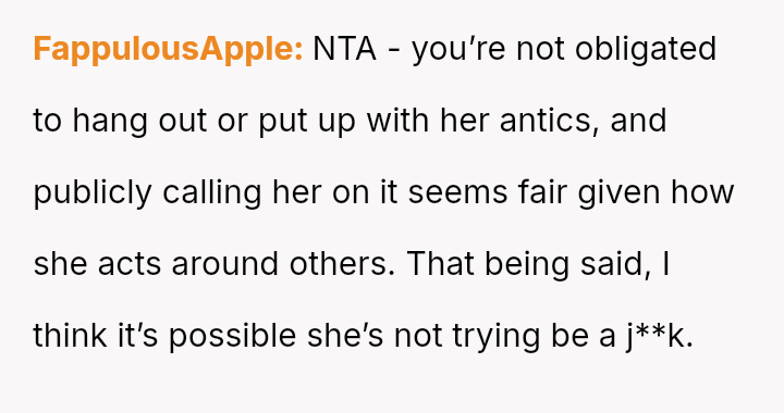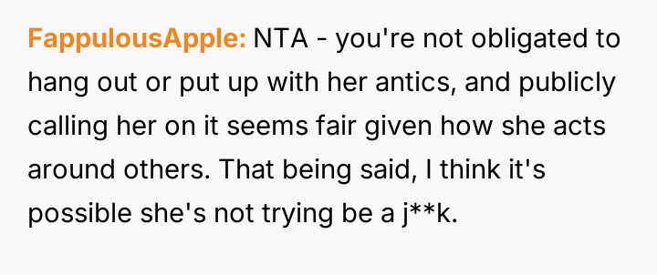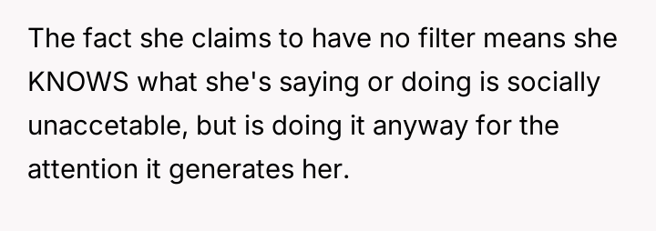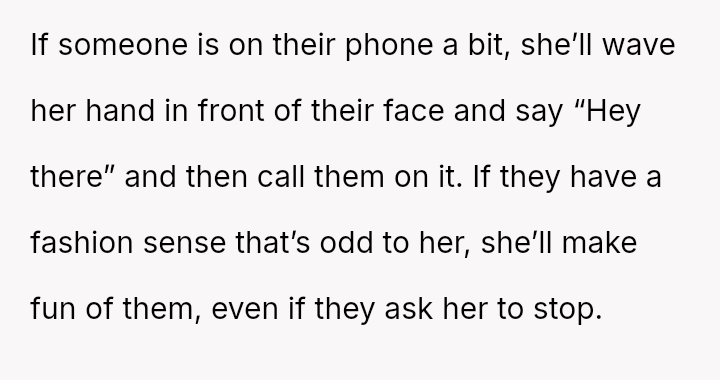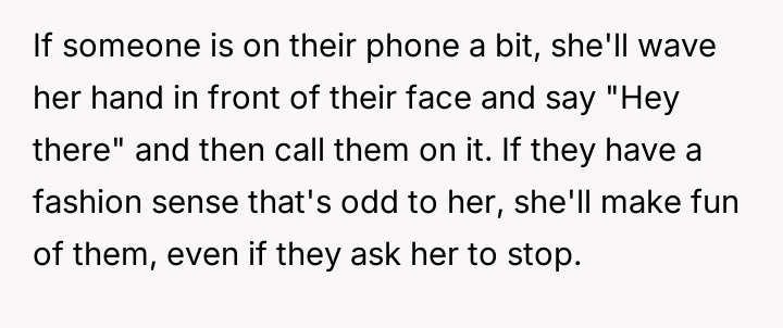 Her lack of a filter turns everyday social moments into minefields, where a casual glance at a phone or an unconventional outfit becomes a spotlight for her biting remarks.
