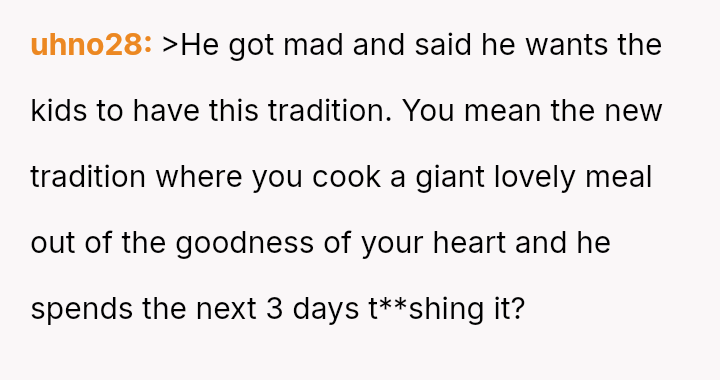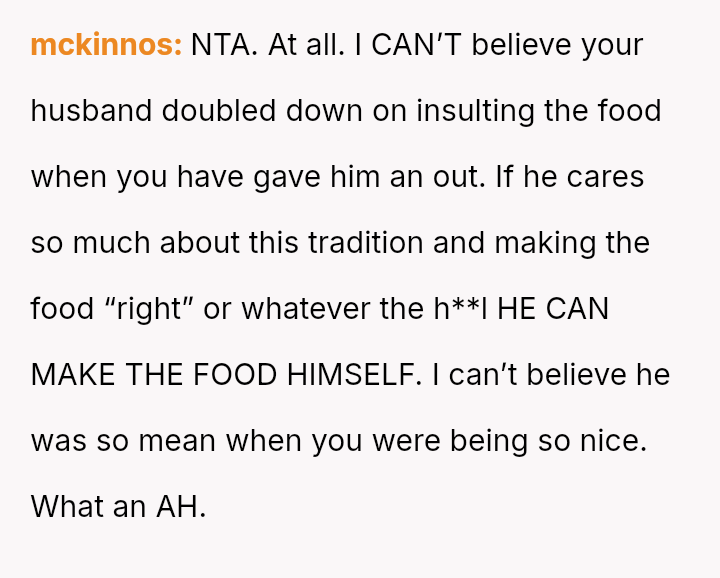 The central conflict arises from the OP's belief that her effort was devalued by harsh criticism, leading her to withdraw from the tradition, while the husband prioritizes maintaining a specific nostalgic experience over validating his wife's feelings and efforts.