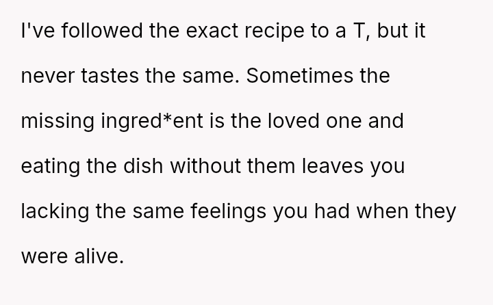 The meal was perfect on the surface, but the heart behind it—the love, struggle, and presence of his mother—was irreplaceable, leaving him grappling with loss and longing in every bite.