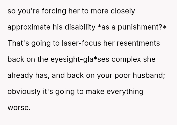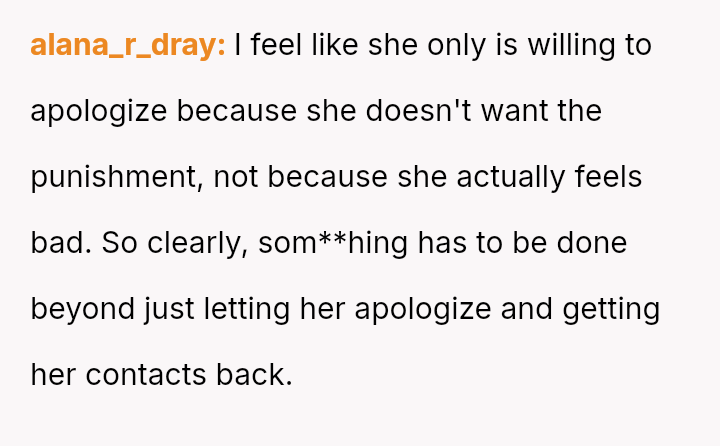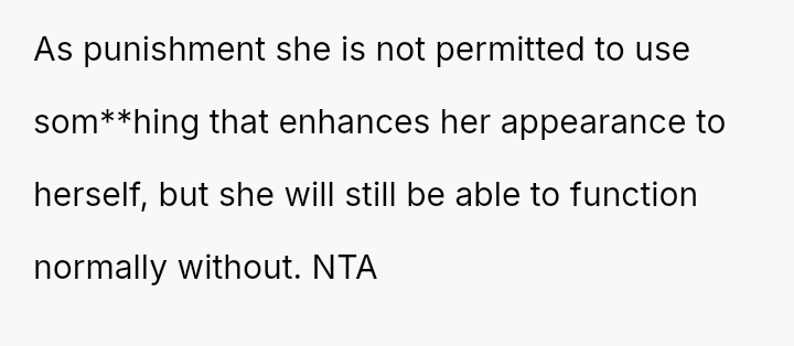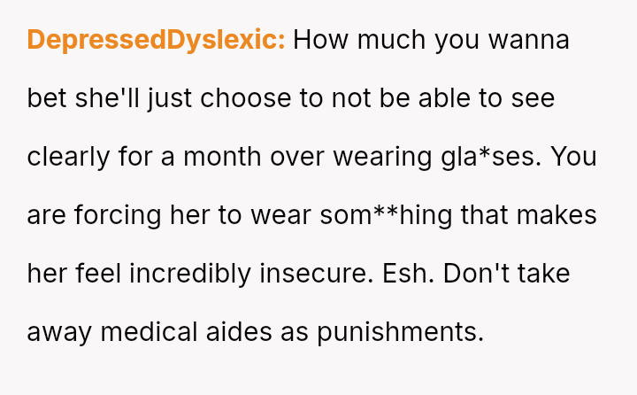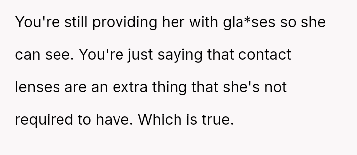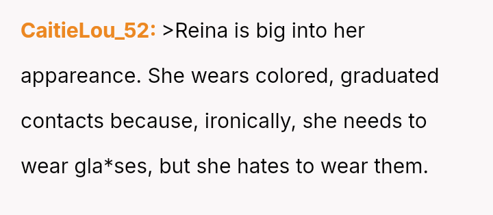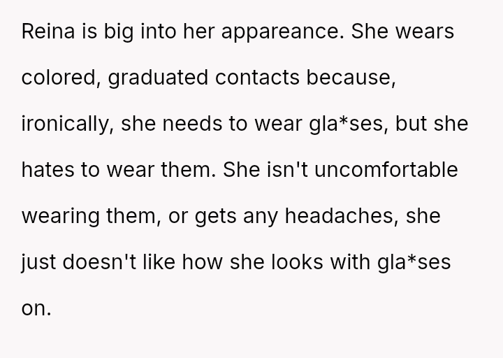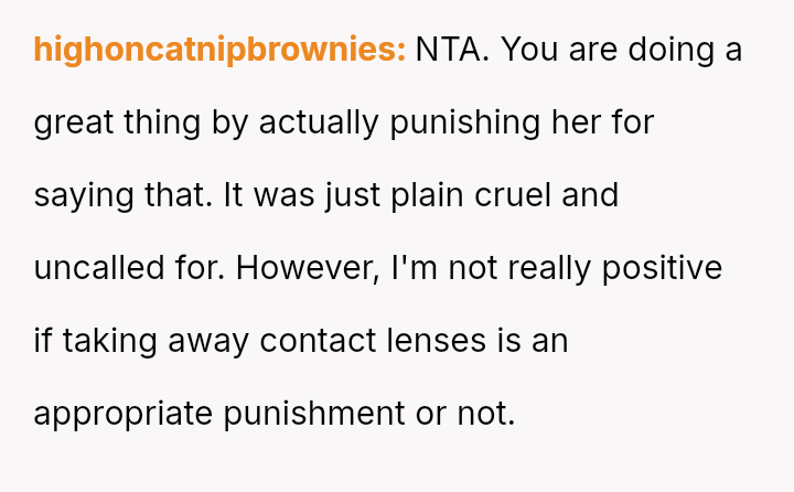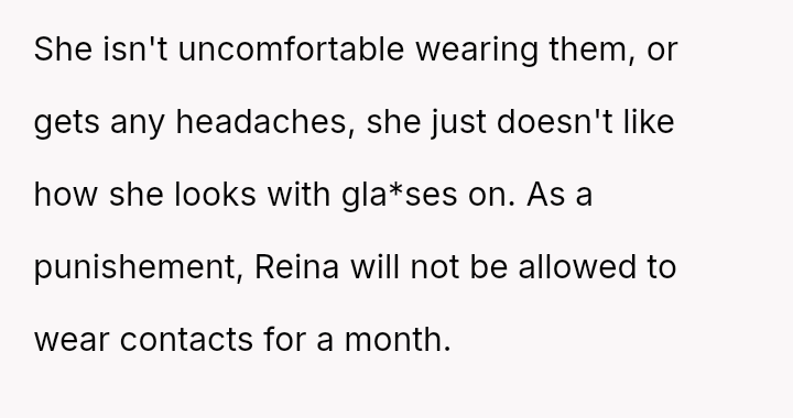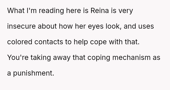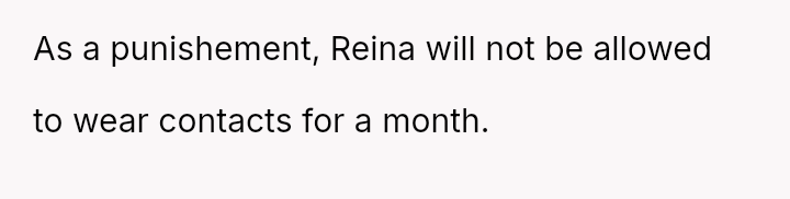 Is the OP justified in imposing a month-long restriction on Reina's cosmetic contact lenses as a consequence for deliberately attacking her father's self-esteem regarding his necessary visual aids, or has the OP overstepped by punishing an appearance-related freedom in response to emotional cruelty?