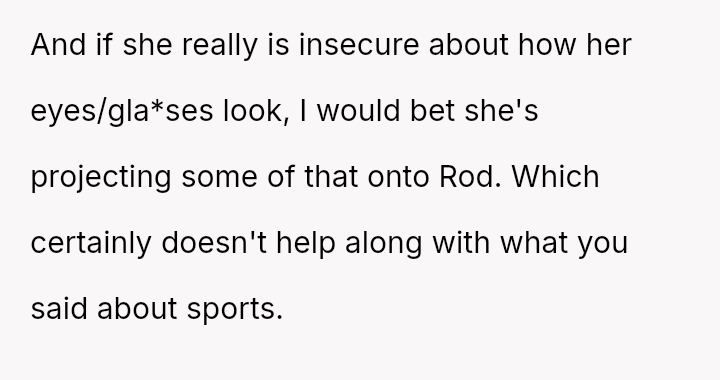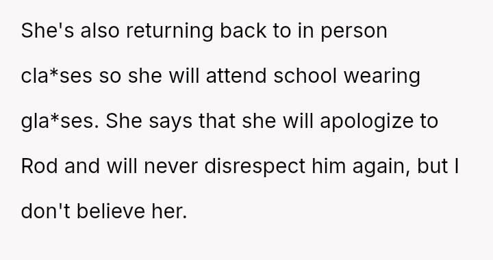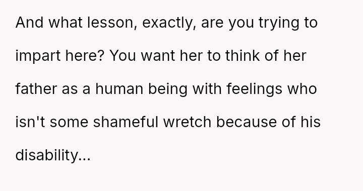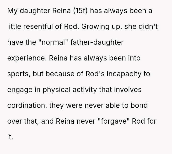The conflict centers on Reina's ongoing resentment towards her legally blind father for perceived limitations in their shared activities, culminating in a public, cruel remark about his necessary corrective eyewear.