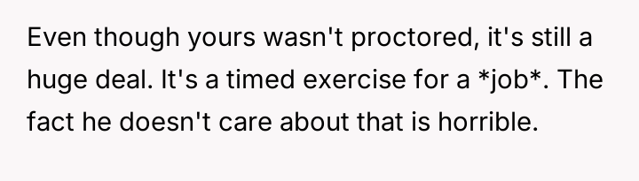 The original poster (OP) is experiencing high stress due to unemployment and an ident*ty crisis, leading to an intense need for focus during a crucial job assessment.