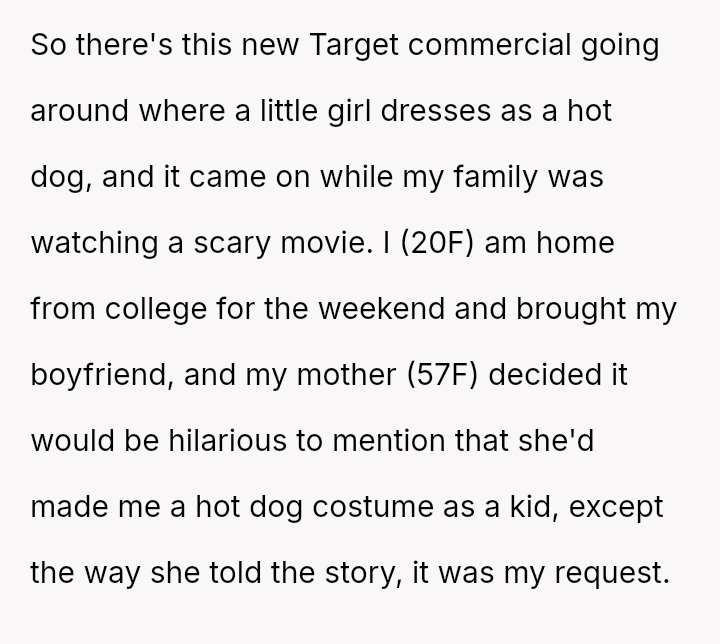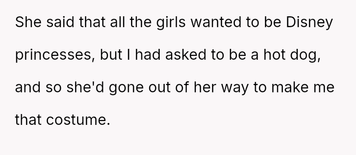 A little girl dressed as a hot dog becomes a symbol of a deeper divide, as a mother’s playful tale clashes with the daughter’s vivid childhood truth.