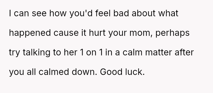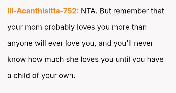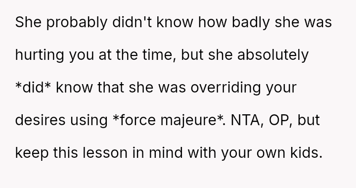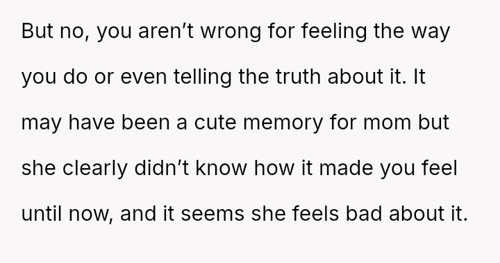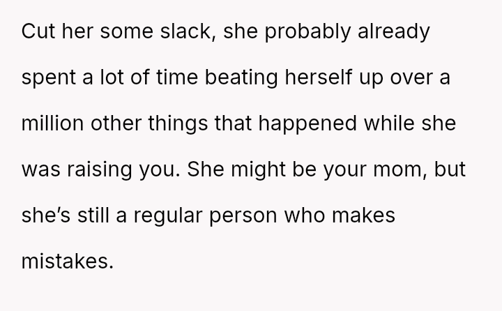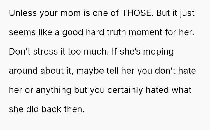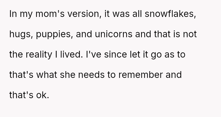The central conflict lies between the mother's desire to present a pleasant, perhaps edited, family narrative and the poster's need to validate their genuine, negative emotional experience.