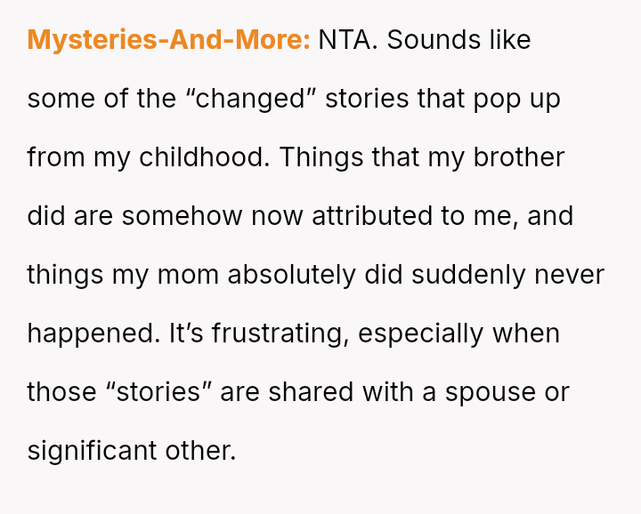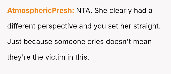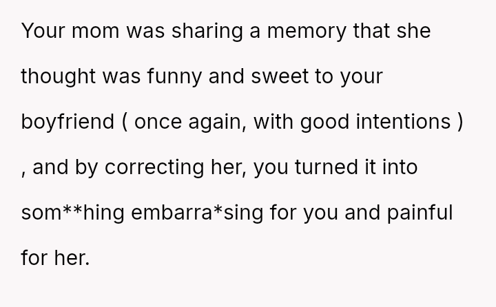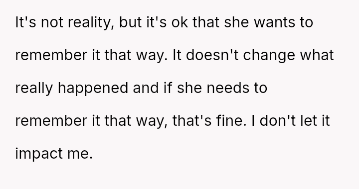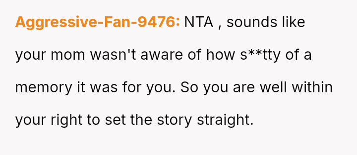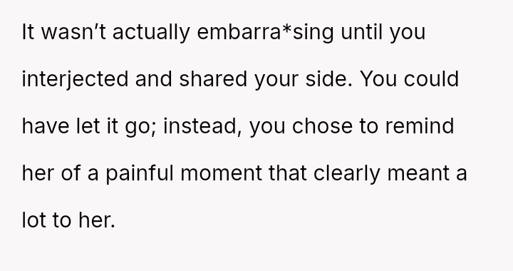 Given that the mother's action seemed intended to rewrite a painful memory publicly, was the poster justified in immediately correcting the record, even if it caused the mother distress, or should they have prioritized avoiding conflict in the moment to protect the mother's feelings?