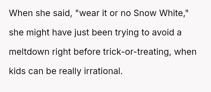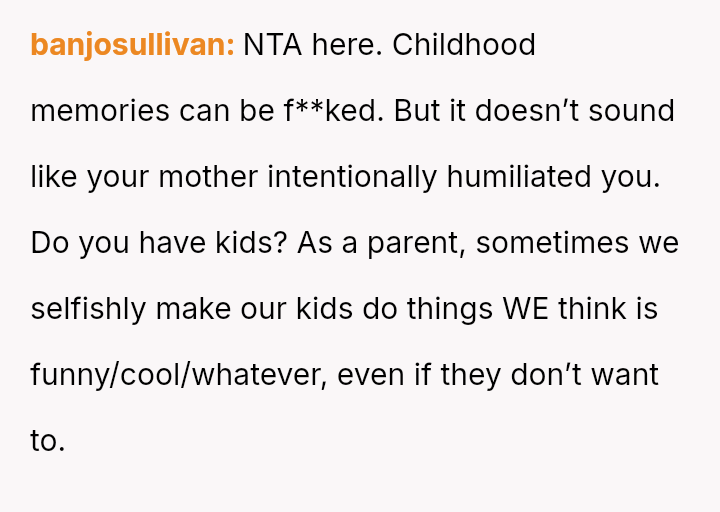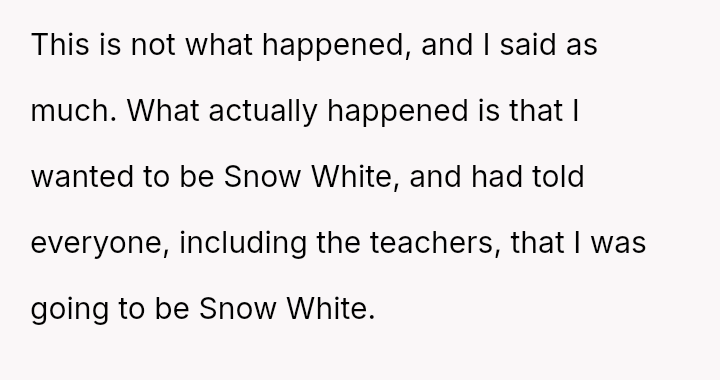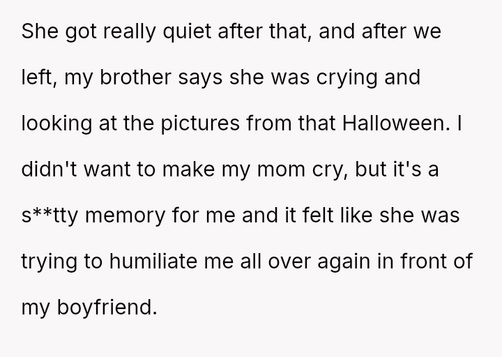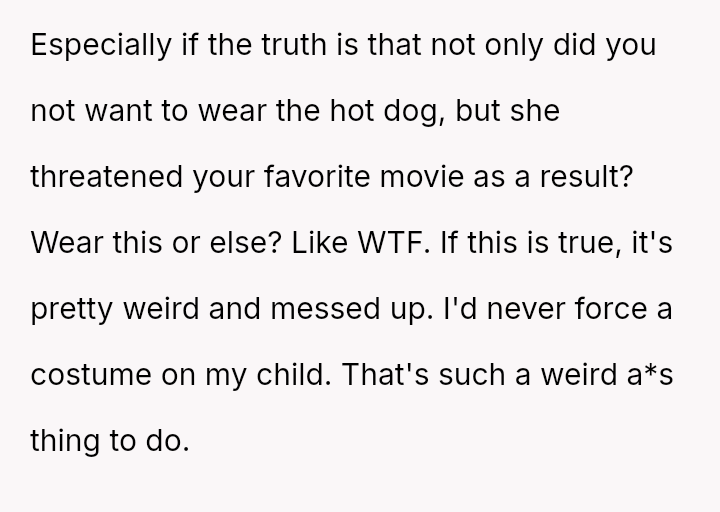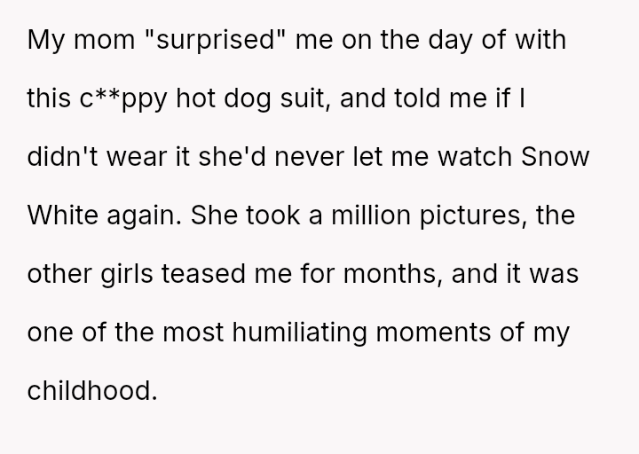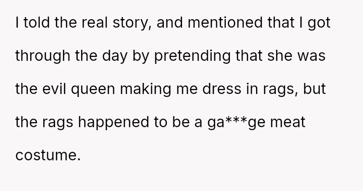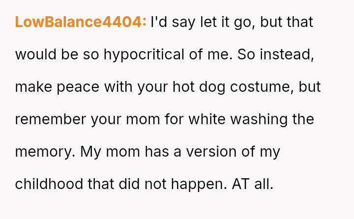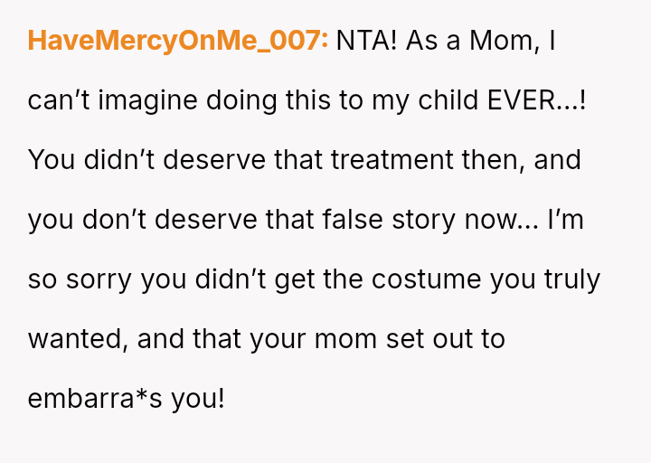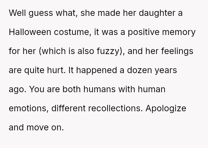 The original poster felt compelled to correct a long-standing false memory presented by their mother, which brought up a source of past humiliation regarding a forced childhood costume.