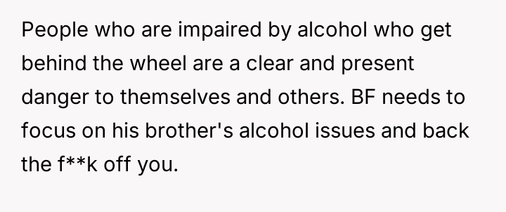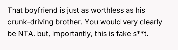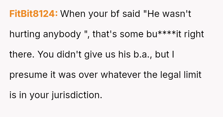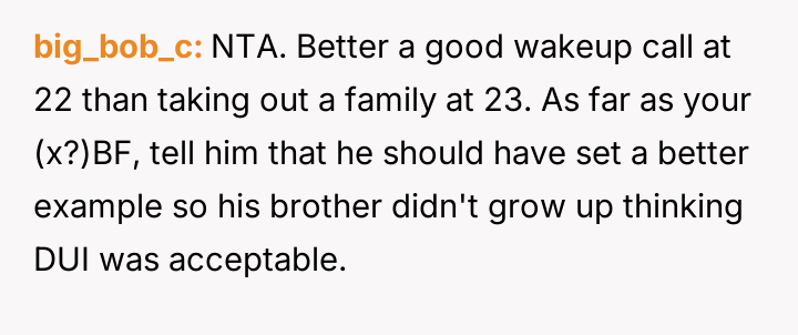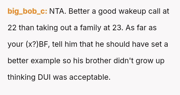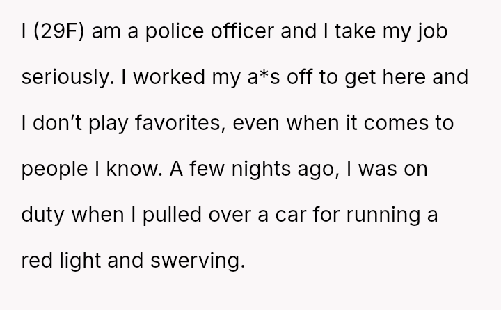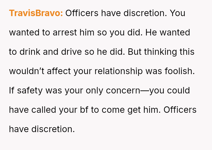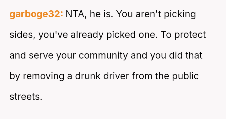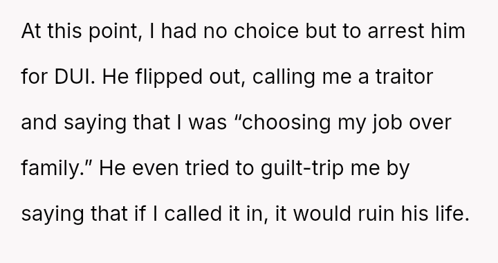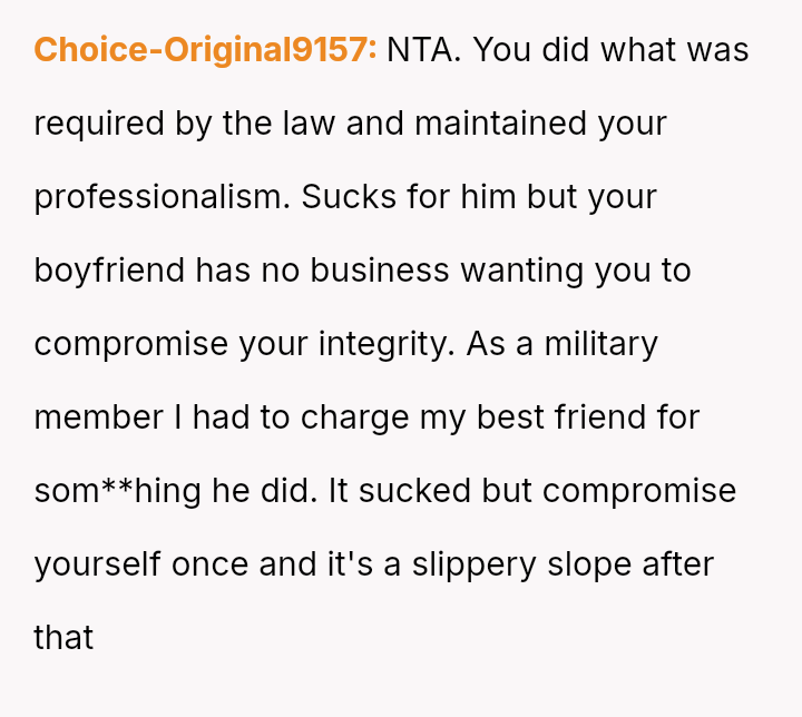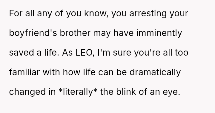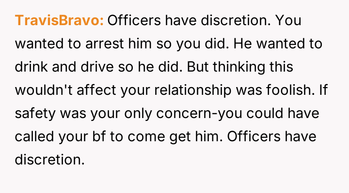 The original poster firmly stands by her professional duty to arrest her boyfriend's brother for a DUI, viewing it as necessary for public safety, which directly conflicts with her boyfriend's desire for her to prioritize family leniency over strict adherence to the law.