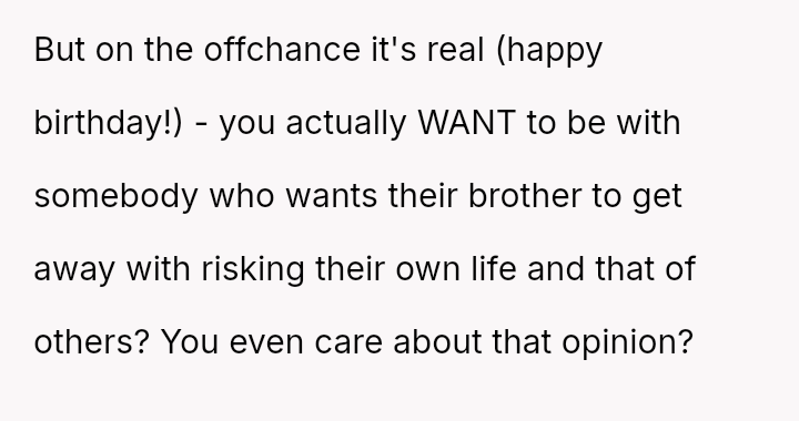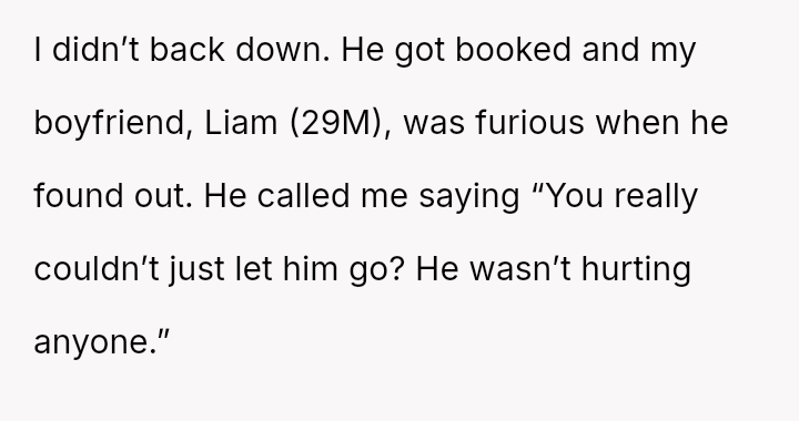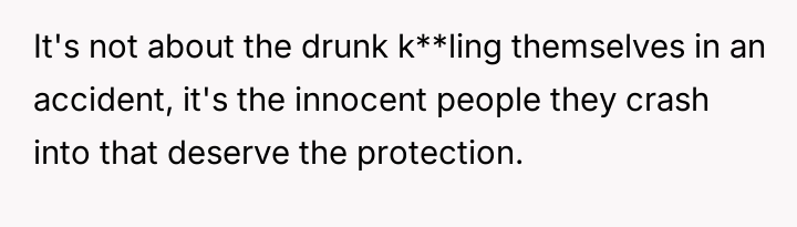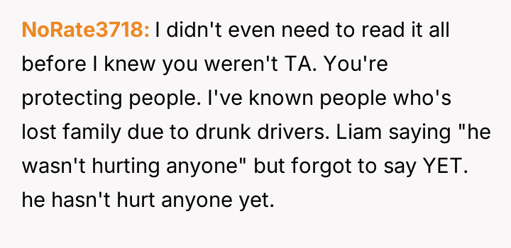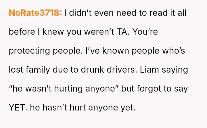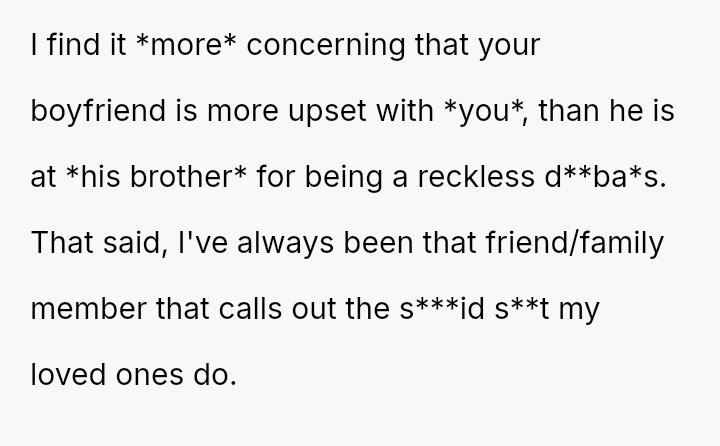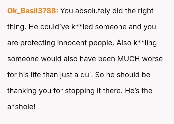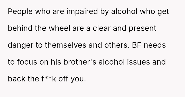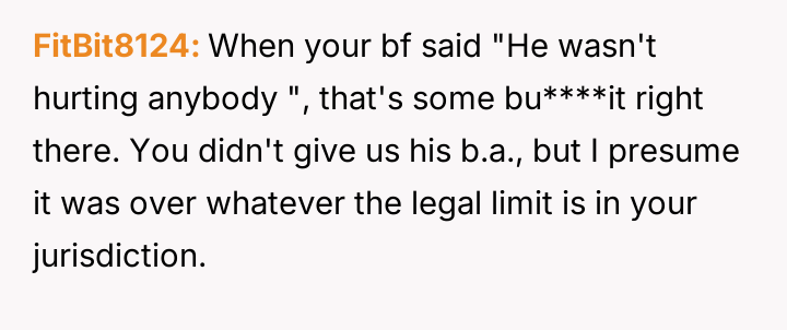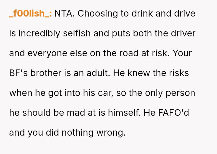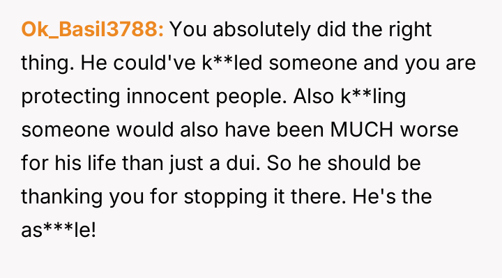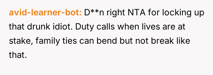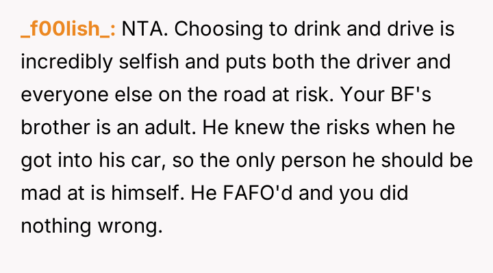 The original poster firmly stands by her professional duty to arrest her boyfriend's brother for a DUI, viewing it as necessary for public safety, which directly conflicts with her boyfriend's desire for her to prioritize family leniency over strict adherence to the law.