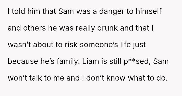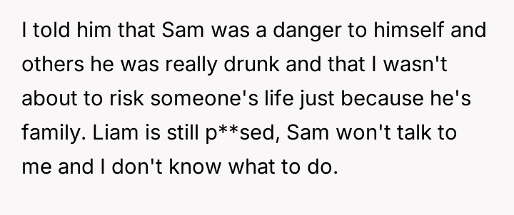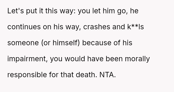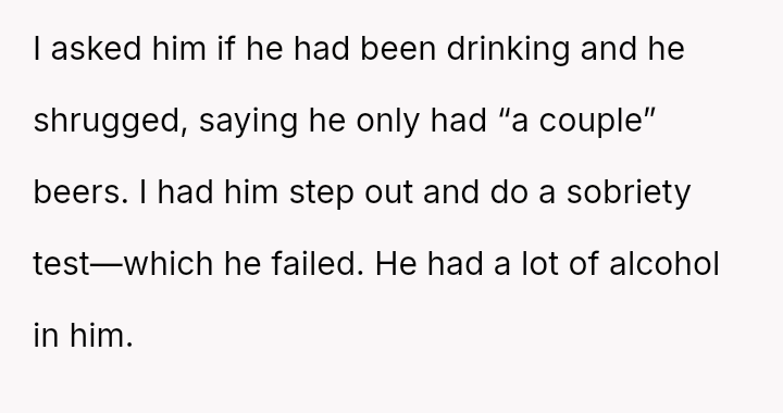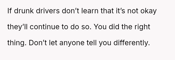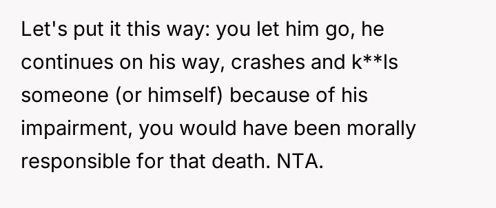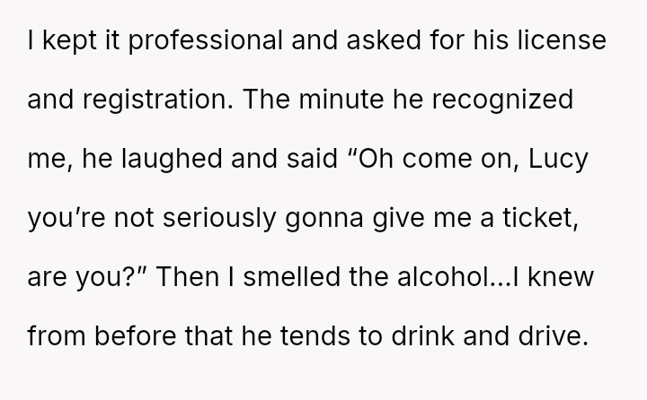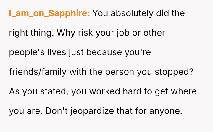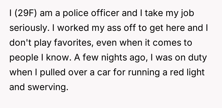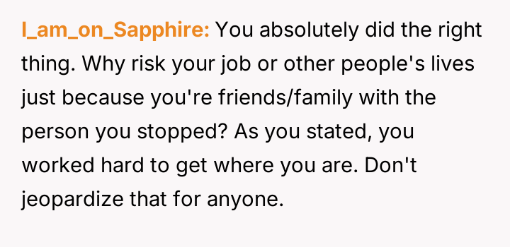 Was the officer justified in upholding the law and ensuring public safety by arresting a family member for a clear DUI, or should she have considered the potential long-term damage to her personal relationships by refusing to look the other way in a situation where no accident had yet occurred?