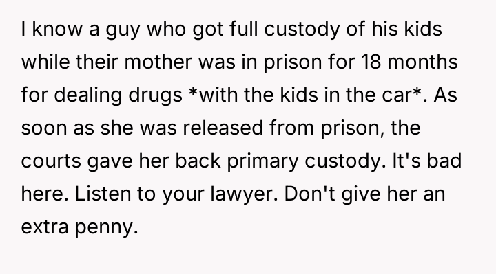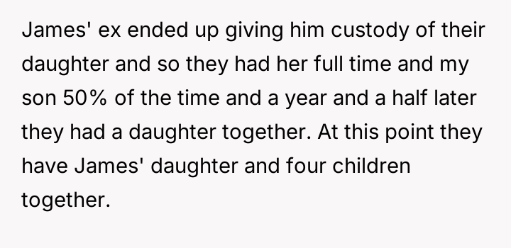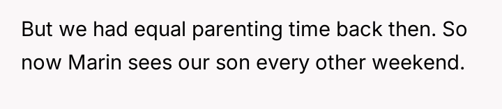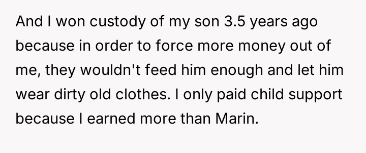 The situation evolved over the years, with the narrator gaining full custody of his son 3.5 years ago due to Marin and James neglecting the child's basic needs to pressure the narrator for more money.